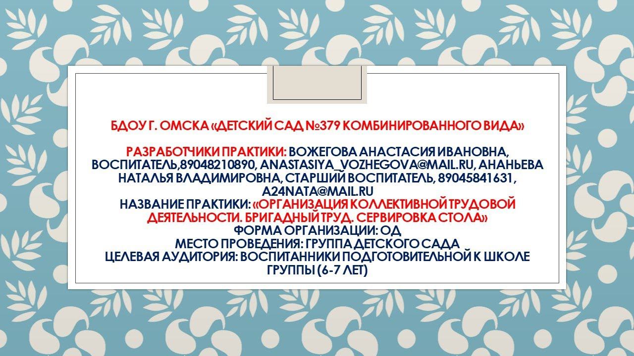БДОУ г. Омска «Детский сад №379 комбинированного вида» Разработчики практики: Вожегова Анастасия Ивановна, воспитатель,89048210890, anastasiya_vozhegova@mail.ru, Ананьева Наталья Владимировна, старший воспитатель, 89045841631, a24nata@mail.ru Название практики: «Организация коллективной трудовой деятельности. Бригадный труд. Сервировка стола» Форма организации: ОД Место проведения: группа детского сада Целевая аудитория: воспитанники подготовительной к школе группы (6-7 лет) Цель: формировать трудовые умения и навыки, умение договариваться друг с другом, работать в бригаде для решения общей задачи по тематической сервировке стола. Задачи: 1. Продолжать учить детей различным вариантам сервировки стола в соответствии с задуманной темой и предложенным блюдом, отбирать необходимую посуду и расставлять ее правильно по порядку. 2. Развивать навыки общения, умения вы-сказывать свою точку зрения и аргументировать свою позицию, проявлять инициативу и самостоятельность, умение прислушиваться к мнению сверстников и требованию бригадира и договариваться друг с другом, работать коллективно в бригаде для решения общей задачи. 3. Развивать умения составлять описательный рассказ при презентации тематического стола. 4. Содействовать воспитанию лидерских качеств, ответственности. 5. Прививать аккуратность в сервировке стола, вызвать желание позаботиться о своих сверстниках, воспитывать желание участвовать в трудовой деятельности, ценностное отношение к труду и его результатам.