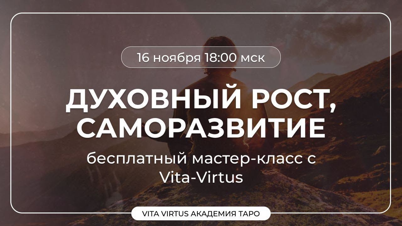 Мастер-класс ""ДУХОВНЫЙ РОСТ И САМОЗАЗВИТИЕ"" ПРИСОЕДИНИТЬСЯ К АКАДЕМИИ ТАРО 10.0 https://vitavirtus.ru/vitavirtusveritas РАСПИСАНИЕ НА НОЯБРЬ ПРИСОЕДИНИТЬСЯ К АКАДЕМИИ ТАРО 10.0 https://vitavirtus.ru/vitavirtusveritas Середина ноября и уже меньше 2х месяцев осталось до Нового года и стартовала Академия Таро 10.0. Но ещё есть время хорошо поработать, чтобы в Новый год шагнуть Счастливой и наслаждаться заслуженными результатами! Четверг, 16 ноября 18-00 мск— бесплатный мастер-класс «Духовный рост, саморазвитие» Вторник, 21 ноября 18-00 мск — бесплатный мастер-класс «Предназначение. Сильные стороны» и «Таро как профессия» Информация с подробной программой мастер-классов и напоминания о времени будут в канале, следите за новостями⬇️ https://t.me/+dA1Ay-oHaeQ4MTVi ПРИСОЕДИНИТЬСЯ К АКАДЕМИИ ТАРО 10.0 ⬇️⬇️⬇️ https://vitavirtus.ru/vitavirtusveritas Пусть этот ноябрь и ваше обучение будут особенными