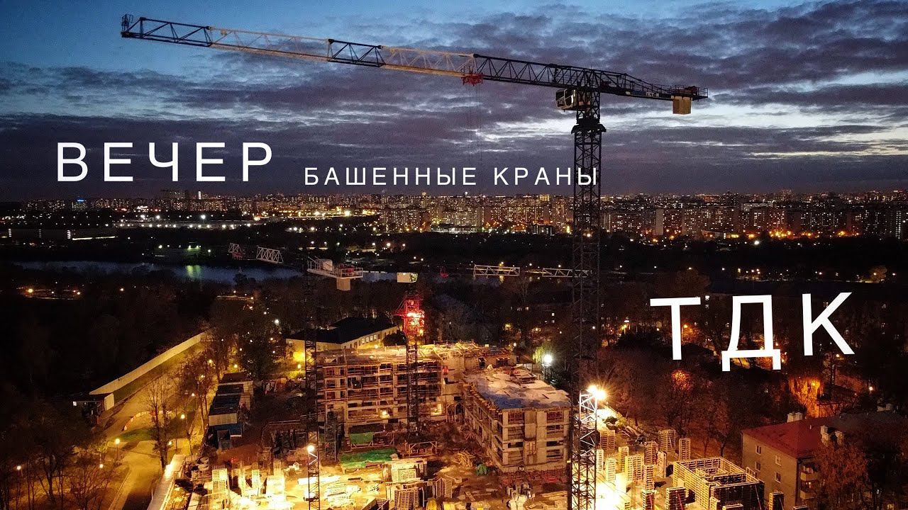 Стройка. Башенные краны TDK. В свете вечерних огней. Tower crane in Moscow