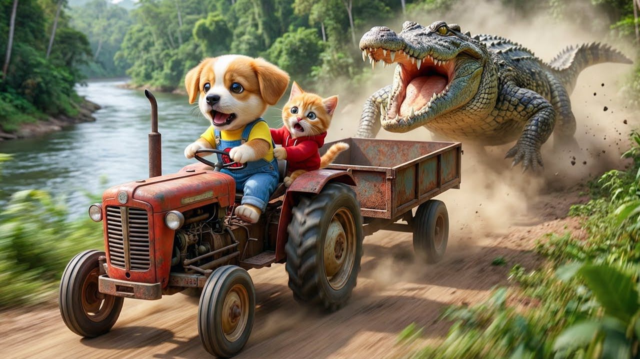 Щенок спасает котёнка из бурного ручья и убегает от огромного крокодила 🐶🐱🐊