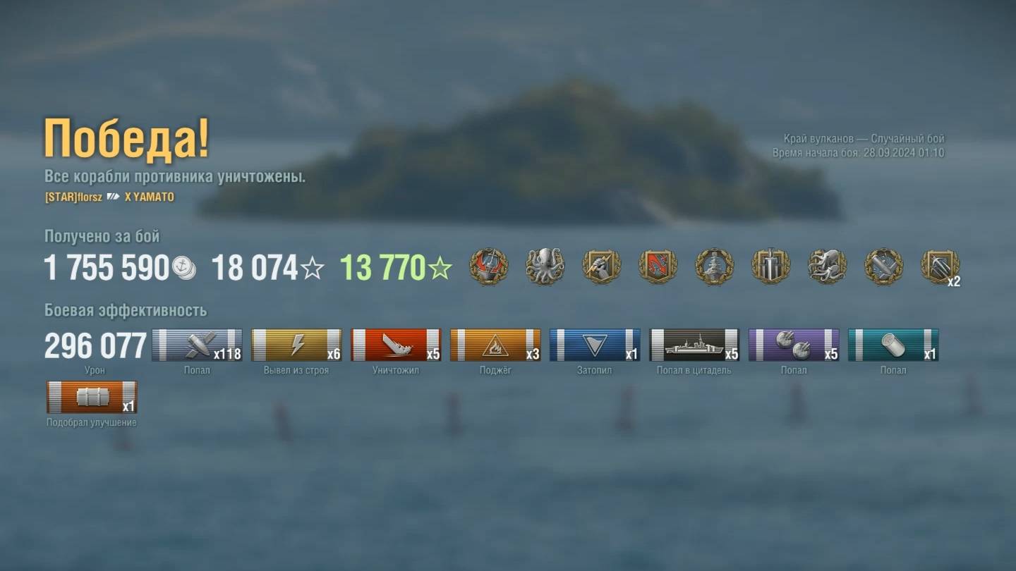 Линкор: Yamato Игрок: florsz (NA) Карта: Край вулканов - Случайный бой Урон: 296к Yamato - Линкор Японии 10 уровня