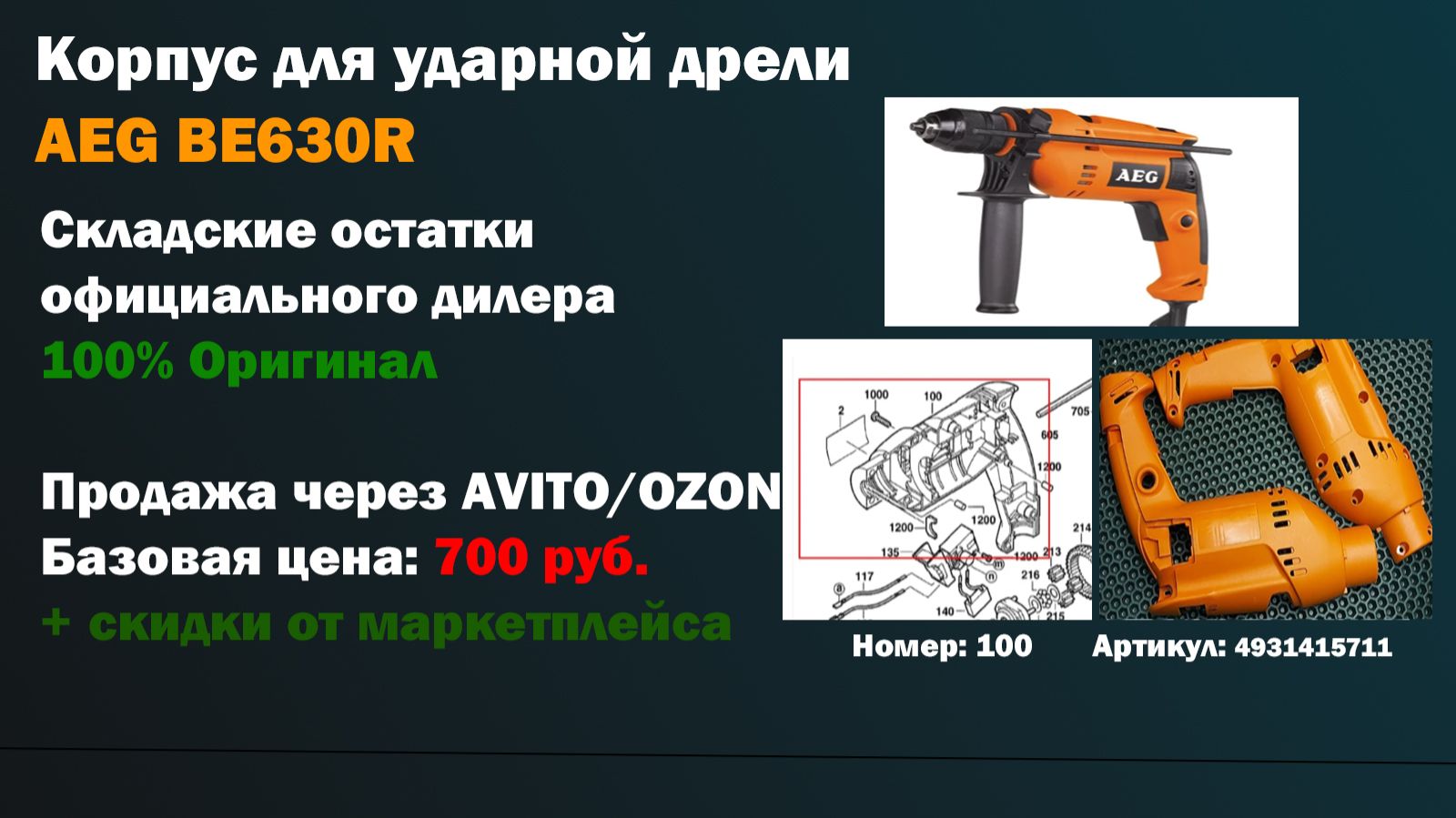 Оригинальный корпус для ударной дрели AEG BE630R 100 корпус 4931415711 По официальным источникам данный ротор подходит для ремонта дрелей: AEG BE630R Данная деталь прошла проверку Цена: 700 руб. https://2uu.ru/4931415711-aeg-be630r/ Артикул для поиска: 2uumilkaeg4931415711 Артикул склада: 3-1-2