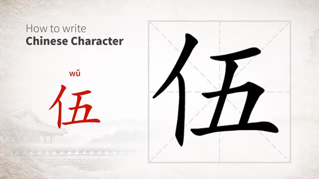 伍 (wǔ) company; to associate with; squad of 5 soldiers; five (bander's anti-fraud numeral)