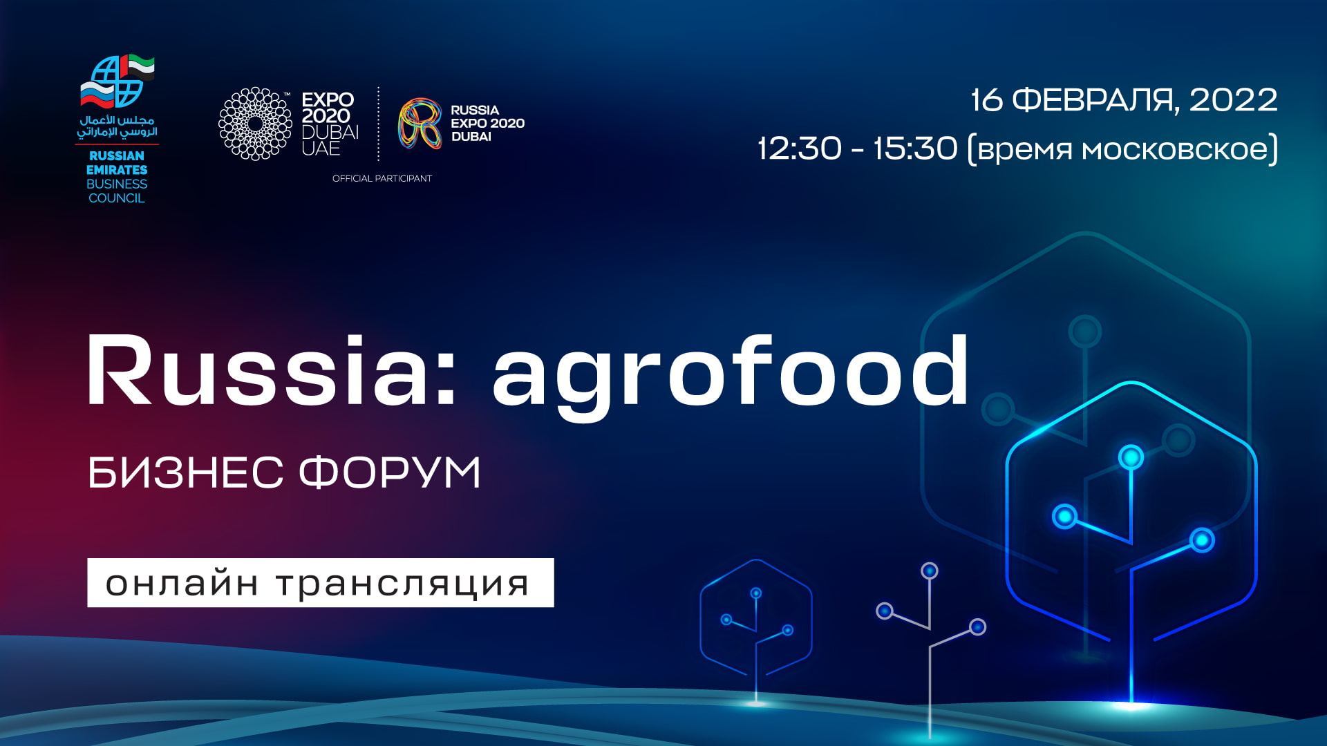 Конференция в рамках Dubai Expo 2020 посвящена развитию фуд-индустрии в России и возможностям выхода российских продовольственных компаний на мировые рынки. В конференции примут участие представители органов власти и лидеры агропромышленной отрасли для обсуждения текущей повестки и грядущих системообразующих изменений. Темы конференции: Международное сотрудничество в сфере продовольствия: возможности для экспортеров Цифровые инструменты в торговле продовольствием Российско-Эмиратский деловой совет: возможности для торговли и инвестиционного сотрудничества с иностранными партнерами Опыт работы российский компаний на рынке ОАЭ и стран Персидского залива: вызовы и истории успеха Павильон российских продуктов питания в ОАЭ: возможности для продвижения продукции российских экспортеров Конференция проводится совместно с Российско-Эмиратским деловым советом, Торгово-промышленная палата России.