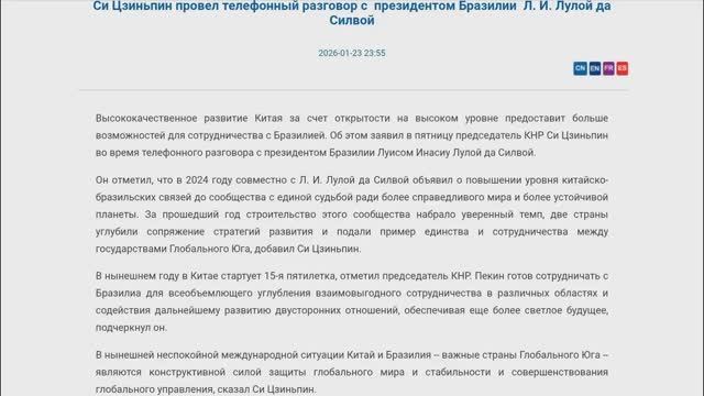 Лидер Китая Си Цзиньпин по телефону с президентом Бразилии Л. И. Лулой да Силвой, 23 января 2026 г.