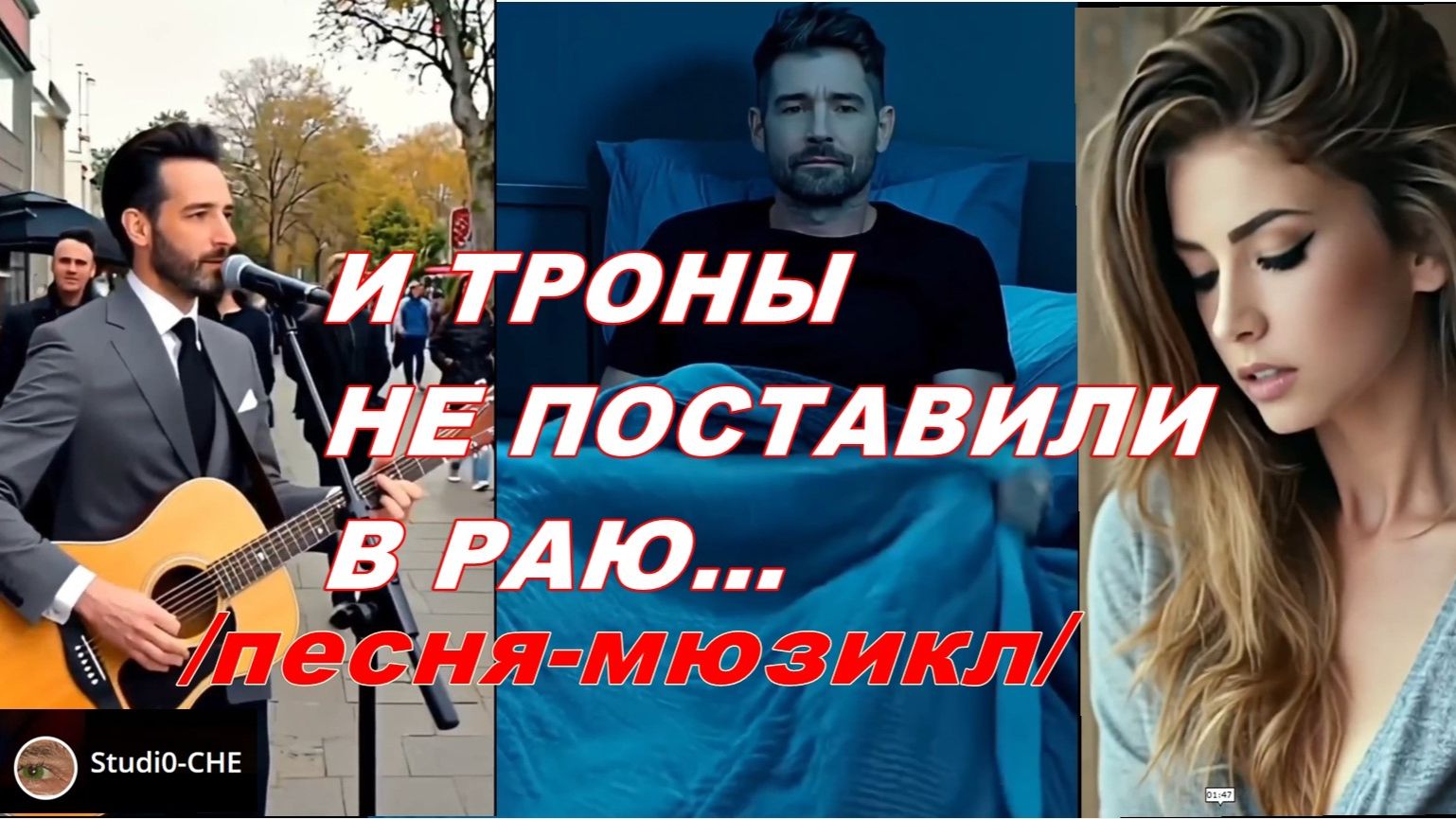 #Studi0-CHE #ТЕКСТ ПЕСНИ: #И ТРОНЫ НЕ ПОСТАВИЛИ В РАЮ... # /песня-мюзикл/ 1.И троны не поставили в раю... И не рисуют шрамов на душе и теле... И журавли не треугольником летели... И не перелистнули ноты соловью... ...И журавли не треугольником летели... И не перелистнули ноты соловью... ПРИПЕВ: И трона не поставили в раю... И не рисуют шрамов на душе и теле... И журавли не треугольником летели... И не перелистнули ноты соловью... ...В багровом пламени сгорю ...Наставшей осенью. И слов тебе наговорю Дождливой россыпью. Перерождаясь на лету В рассвет с туманами, К твоим ногам я упаду Другим обманутой.. А ты заметишь и поймешь - Тебе я верная. И ненароком позовёшь От края... Первую... ...И ненароком позовёшь От края... Первую...Первую... 2.Софиты так и не зажглись В момент интимного застоя Не задалась модель раскроя, Волокна нитей заплелись, Лохматясь очередью тесной, Когда игла колола ткань, Не соблюдая кромки грань, Стежок ложился неуместно. И отсвет ламп не в полный ватт, И запоздала к часу смена... Пижаму эту не надену - В постели шовчик грубоват. ПРИПЕВ (тот же) 3...Софиты так и не зажглись В момент интимного застоя Не задалась модель раскроя, Волокна нитей заплелись, Лохматясь очередью тесной, Когда игла колола ткань, Не соблюдая кромки грань, Стежок ложился неуместно. И отсвет ламп не в полный ватт, И запоздала к часу смена... Пижаму эту не надену - В постели шовчик грубоват... ...В постели шовчик грубоват... ...Грубоват... ПРИПЕВ (тот же) ******** #музыка #мюзикл #авторская песня #Rutube.ru ...Бывает иногда у человека состояние, когда всё - НЕ ТАК!...