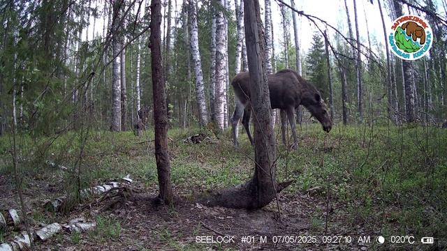 07.05.2025.Лось.Заповедник Большая Кокшага.Лесной гигант остановился у камеры, обнюхал ветку и ушел