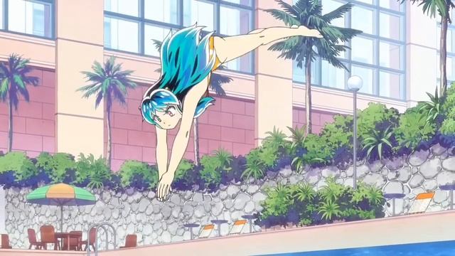 Лам прыгает в воду бассейна.