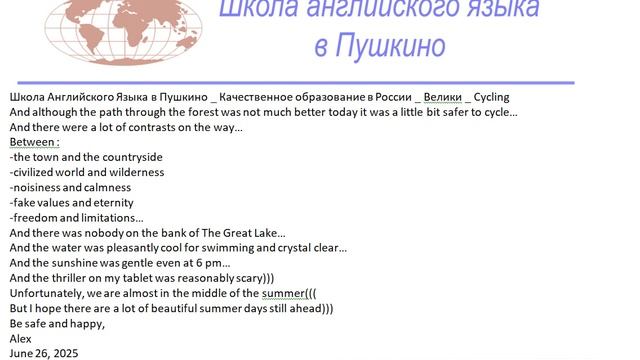 Школа Английского Языка в Пушкино _ Качественное образование в России _ Велики _ Cycling And although the path through the forest was not much better today it was a little bit safer to cycle… And there were a lot of contrasts on the way… Between : -the town and the countryside -civilized world and wilderness -noisiness and calmness -fake values and eternity -freedom and limitations… And there was nobody on the bank of The Great Lake… And the water was pleasantly cool for swimming and crystal clear… And the sunshine was gentle even at 6 pm… And the thriller on my tablet was reasonably scary))) Unfortunately, we are almost in the middle of the summer((( But I hope there are a lot of beautiful summer days still ahead))) Be safe and happy, Alex June 26, 2025