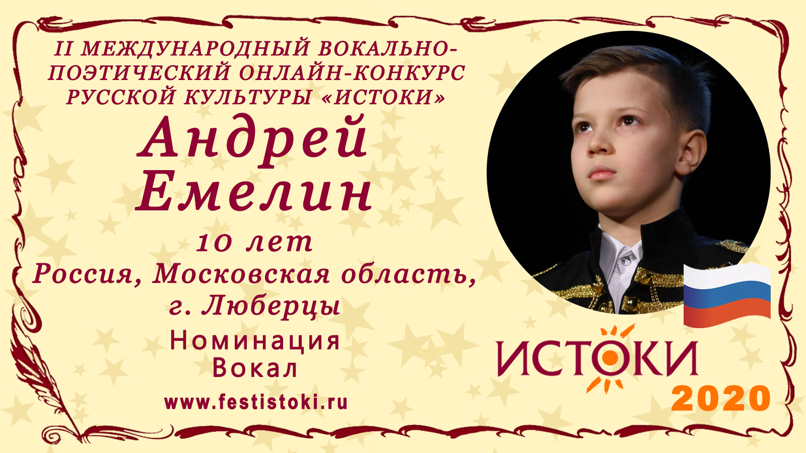 Лауреат II степени II Международного вокально-поэтического онлайн-конкурса русской культуры «Истоки». Номинация - Вокал. Песня "Взмахни крылами, Русь!". Автор Вячеслав Тюльканов. Сайт: www.festistoki.ru / www.festistoki.com E-mail: festistoki@mail.ru