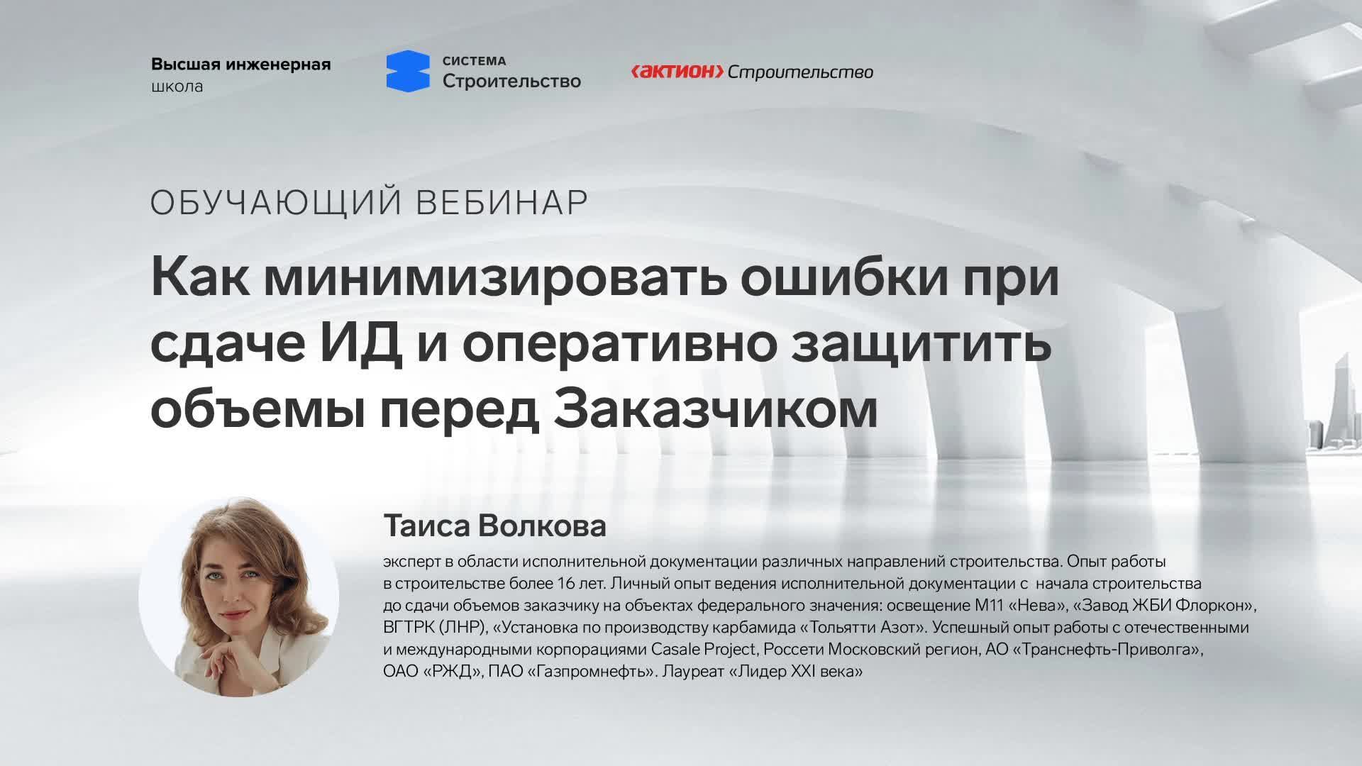 Как минимизировать ошибки при сдаче ИД и оперативно защитить объемы перед Заказчиком 1. На какие факторы при подготовке ИД нужно обратить особое внимание, чтобы не допустить критических ошибок 2. Как и почему журналы общих и специальных работ срывают подписание КС-2 3. Как контролировать объемы работ в условиях удаленных и протяженных объектов 4. Применение нового СП543 на практике: первые трудности и пути решения
