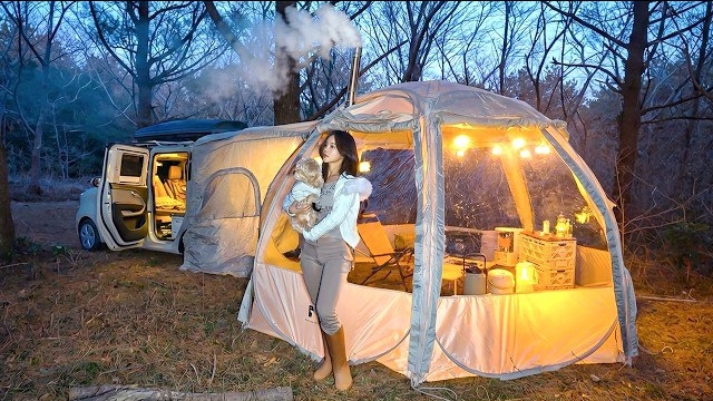 Кемпинг в глухом лесу в прозрачной купольной палатке. Готовлю банановый кастелло и куриный суп