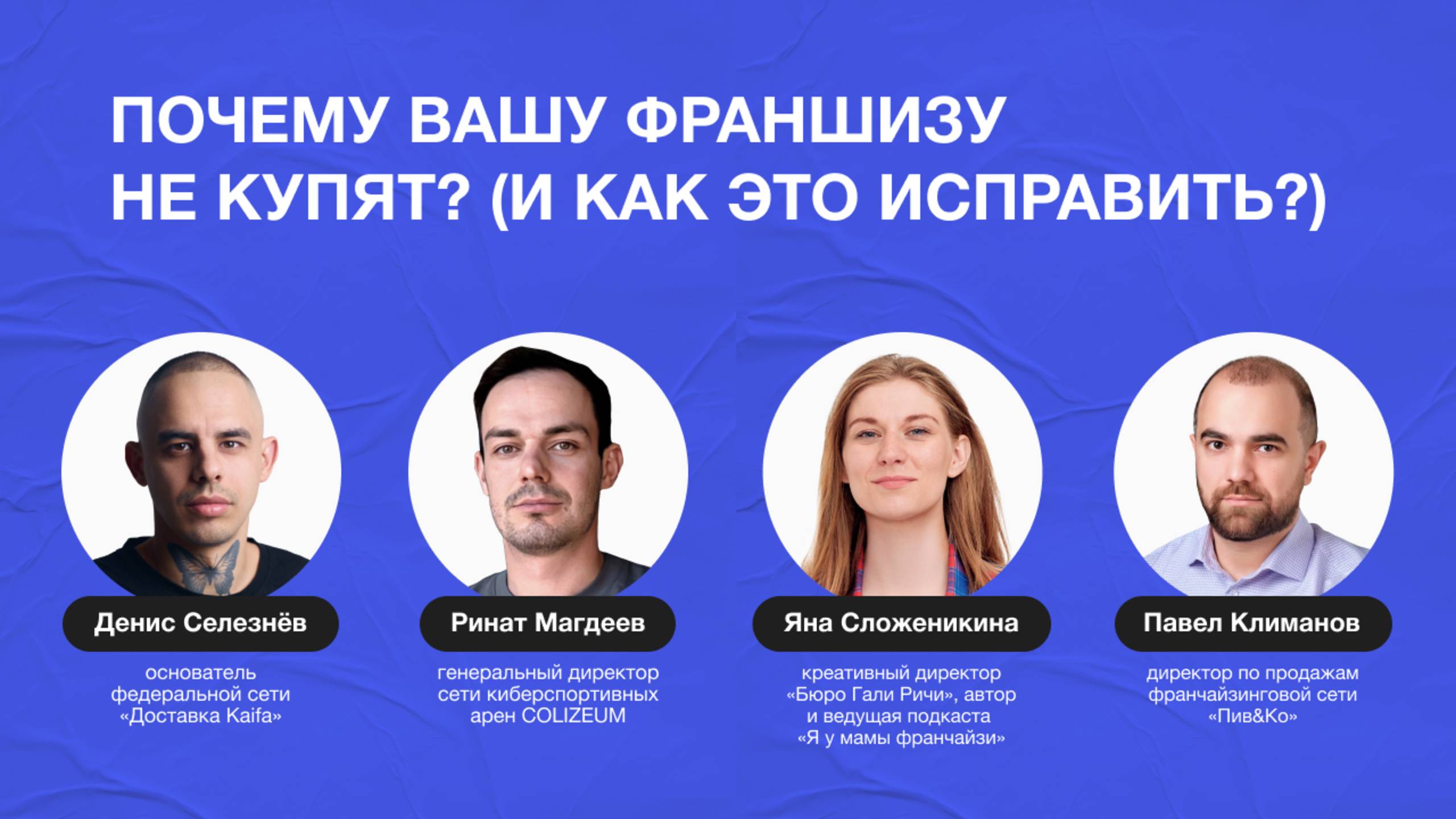 Модератор: 🗣Яна Сложеникина — креативный директор «Бюро Гали Ричи», PR-директор организации «Женщины бизнеса», (https://t.me/ruslady_org) автор и ведущая подкаста «Я у мамы франчайзи» (https://t.me/ilovefranchise) Спикеры: 🗣Ринат Магдеев — генеральный директор управляющей компании COLIZEUM (https://t.me/colizeumarena) — франшизы № 1 по версии Forbes, крупнейшей сеть киберарен в мире с более чем 600 филиалами 🗣Денис Селезнёв (https://t.me/dsseleznyov) — основатель федеральной сети «Доставка Kaifa» (https://t.me/dostavkakaifa) с 85 точками по России, автор книги «Жить в кайф», эксперт РБК 🗣Павел Климанов — директор по продажам франчайзинговой сети «Пив&Ко», (https://t.me/s/pivko_official?before=471) продал более 1000 франшиз с 2017 года Приобрести место на образовательной программе «Директор по франчайзингу» можно уже сейчас: https://dipglobal.ru/program/direktor-po-franchayzing.. Используйте промокод на дополнительную скидку 10% - DIP10