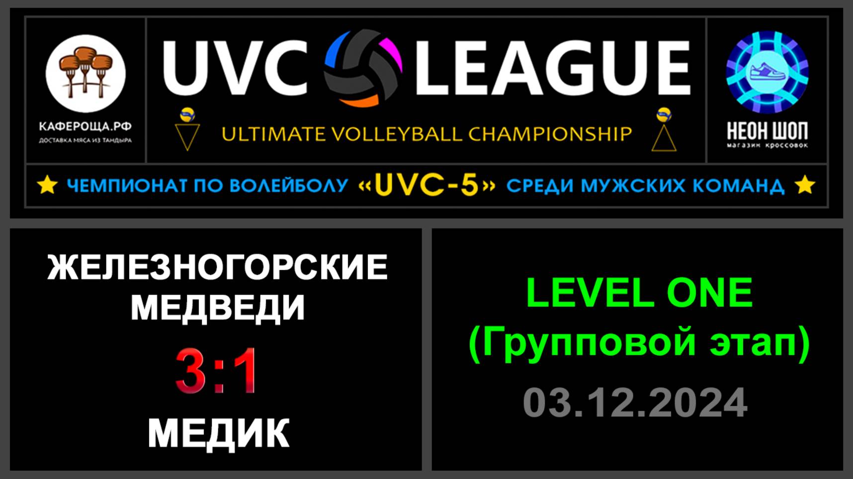 UVC-4 (Мужчины): Чемпионат UVC Лиги по волейболу среди мужских команд, 2024-2025 гг. Результаты игры: LEVEL ONE (Групповой этап) 03.12.2024 Железногорские медведи - Медик 3:1 (25:19, 25:18, 18:25, 25:20) Конкурс «Робин Гуд»: ⛔Точных попаданий не было! #UVC_ЛИГА_ЧЕМПИОНАТ_UVC_5_Мужчины
