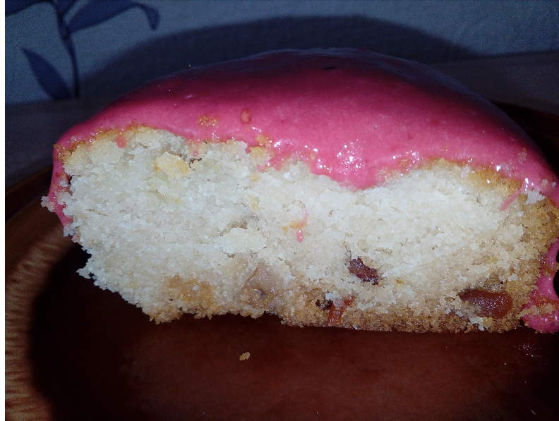 Диаметр 18 - манка 140 гр - вода 200 мл - сахар 150 гр - изюм 55 гр - сода 5 гр - мука 115 гр - масло растительное 100 мл Время выпечки 35-40 мин, температура 180* ГЛАЗУРЬ: -малина 500 гр -сахар 150 гр - вода 50 мл - лимонная кислота 1 гр Сахарный сироп уварить до темп.110*, довавить малину ( пюре), лимонную кислоту и уварить до темп.115 Эатем остудить до 60-55* и взбить