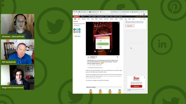 Instagram quiz stickers and Facebook advertising tool updates are two of the main topics we discussed this week on the social media marketing talk show, Social Chatter. http://www.socialchefs.com/instagram-quiz-stickers-and-facebook-advertising-tools/ Join Christian Karasiewicz, Phil Gerbyshak, and guest, Geige Vandentop, Co-Founder of StreamYard, a powerful live video tool, to learn about the latest social media marketing news from this past week. Here is a list of the topics that we covered this week on the social media marketing talk show. Topics discussed: - Instagram quiz stickers for Stories - Updates to Facebook advertising tools - Facebook 3D photos for Stories and the web - And much more Tools and apps mentioned during the show: Backpack Studio, a portable audio recording app for podcasts, live video and more from mobiel. http://www.socialchefs.com/go/backpack-studio-ios/ Blogcast, a tool that uses artificial intelligence to convert your blog post into an audio version. http://www.socialchefs.com/go/blogcast/ If you would like to join next week's episode of Social Chatter, the weekly social media marketing talk show, we will be broadcasting live on our Facebook Page at http://www.facebook.com/socialchefs. Should you have additional questions on the social media news covered in this week's episode of Social Chatter, please contact us. http://www.socialchefs.com/contact Subscribe to us on YouTube channel: https://www.youtube.com/subscription_center Web: http://www.socialchefs.com Facebook: http://www.facebook.com/socialchefs Instagram: http://www.instagram.com/socialchefs Twitter: http://www.twitter.com/socialchefs