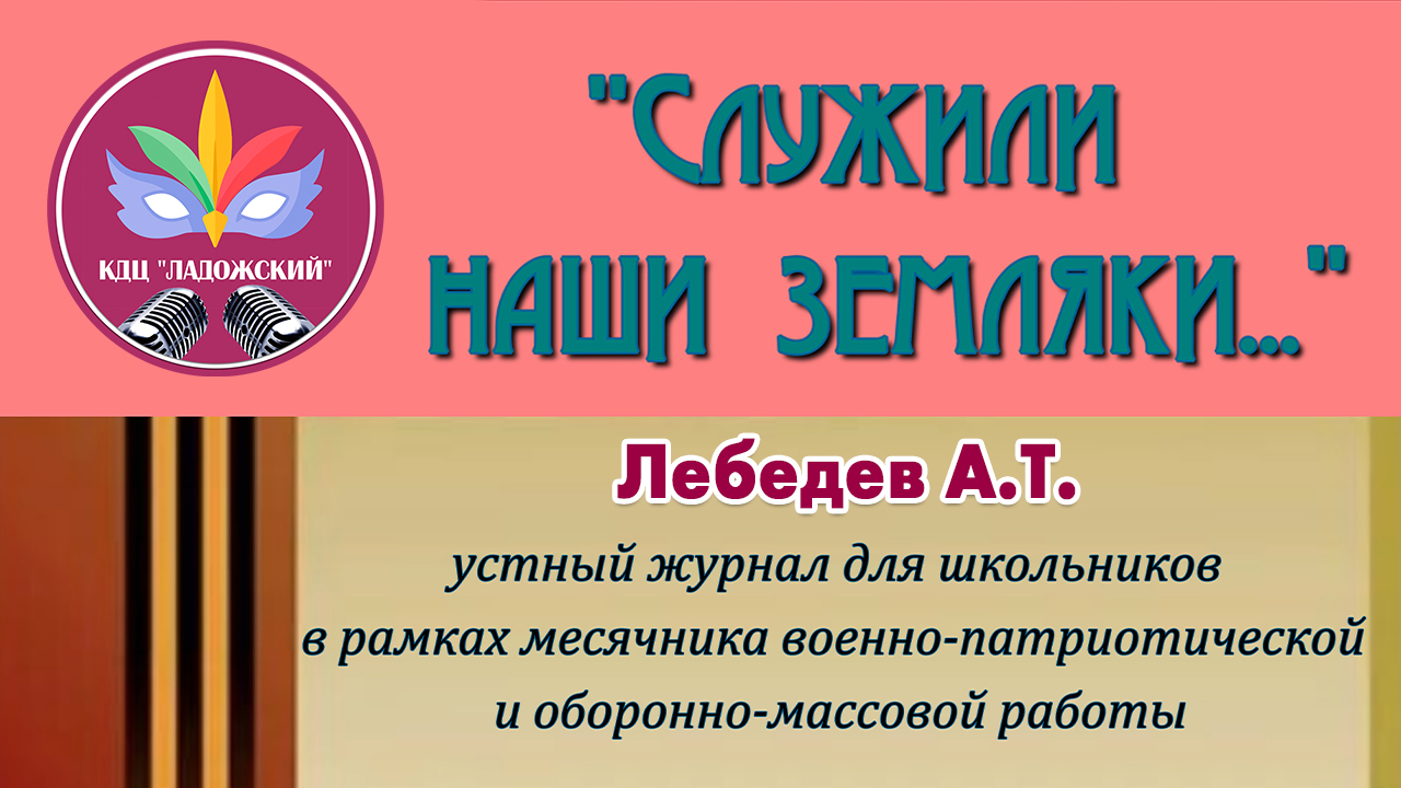 Добрый день, дорогие друзья! Представляем Вашему вниманию цикл публикаций в рамках устного журнала для школьников «СЛУЖИЛИ НАШИ ЗЕМЛЯКИ» Лебедев А.Т. https://youtu.be/wYYcxARgw5I #КультураОнлайн #КультураОнлайнДетям #КДЦЛадожский #БудьКруче #ЖивиЯрко #Удалёнушка2022