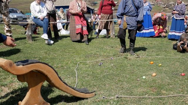Детская игра на Красную горку - катание яиц с горки. Село Тулата, Чарышский район, Алтайский край; 5.5.2021 Проводит анс. "Канареечка" из Красного Партизана того же района; участвует анс. "Отечество" (Новосибирск) и местные жители. Снято на Panasonic G80; все три уровня стаба включены. Небольшая стабилизация в Da Vinci прилагается.