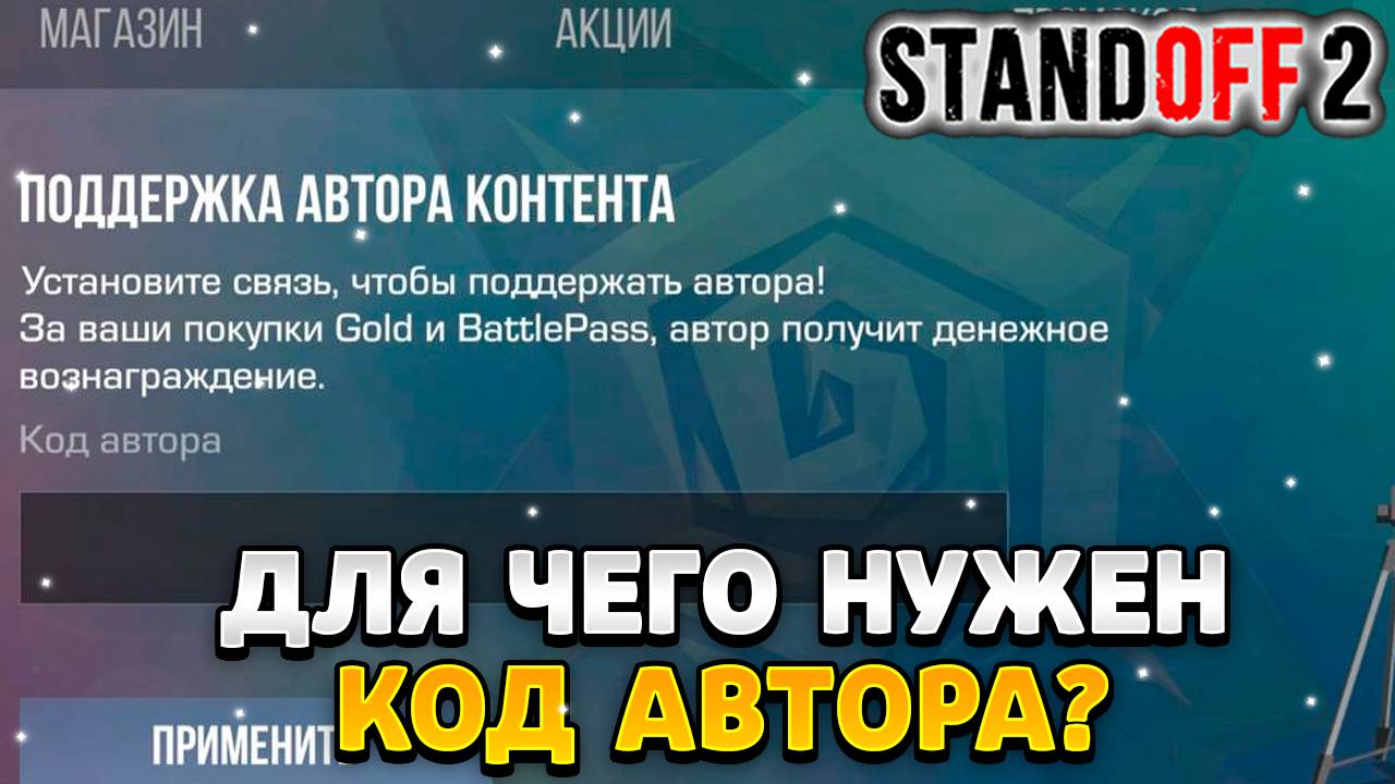 Сегодня я тебе расскажу,для чего нужен код автора в standoff 2 в 2024 году. Ведь многие игроки задаются вопросом,зачем нужен код автора в стандофф 2 в 2024 году. На самом деле код автора нужен для того чтобы поддерживать ютубера материально в самой игре. Чем больше ты донатишь,тем больше он получает за это денег. Более детально смотри видео,для чего нужен код автора в standoff 2 в 2024 году. Приятного просмотра. P.s. HawK Standoff 2. Хештеги: #standoff #standoff2 #стандофф #стандофф2 #стэндофф Standoff 2 - представляет собой классический шутер от первого лица с различными режимами игры и арсеналом современного российского и иностранного оружия. Каждое оружие обладает различным набором характеристик, ограничивающих тактические возможности игрока: пробиваемость брони, отдача, темп стрельбы, цена, награда за убийство, боезапас. В отличие от большинства мобильных шутеров, в Standoff 2 отсутствует автострельба и помощь в наведении, но в то же время есть и гибкая настройка управления: возможность перемещать, изменять видимость и размеры большей части элементов интерфейса. За реальные деньги в игре продаются только декоративные предметы, не влияющие на игровой процесс.