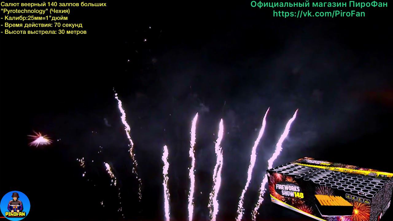 https://vk.com/pirofan - распродажа в нашем официальном магазине Салют веерный 140 залпов больших "Шоу фейерверков" (Чехия) - Калибр:25мм=1"дюйм - Время действия: 70 секунд - Высота выстрела: 30 метров - Есть сертификат и гарантия от ПироФан