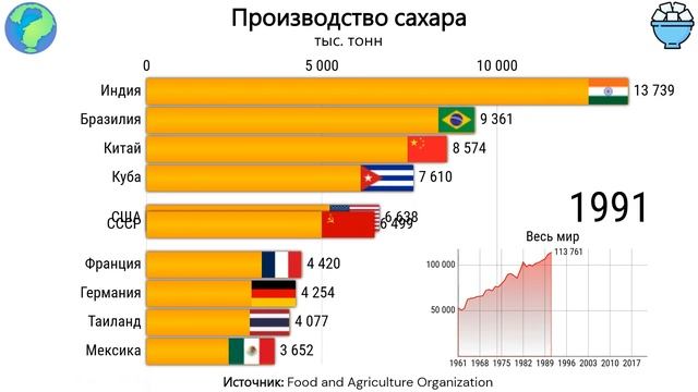 САХАР: ТОП 10 стран мира по производству сахара (1961–2022)