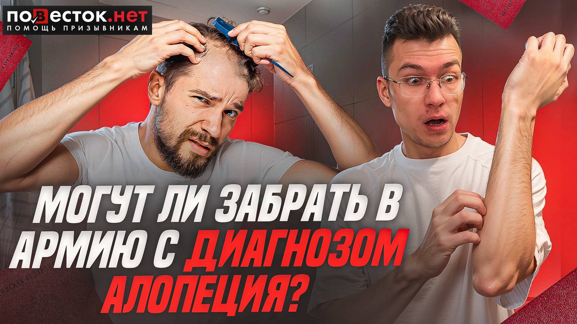 Правда ли, что с алопецией могут не взять на срочную службу? Сейчас мы ответим на этот вопрос. Спойлер: иногда алопеция действительно может стать основанием для освобождения от призыва. Но не всегда. Помогаем законно освободиться от службы в армии. Вы всегда можете получить бесплатную консультацию специалистов компании "Повесток.нет" по ссылкам ниже: https://povestok.net/ https://vk.com/vprizyve https://t.me/vprizyve 8-800-600-31-58 - бесплатная горячая линия для призывников! ____________________________ Наша компания не пропагандирует уклонение от военной службы и совершение действий, запрещенных действующим законодательством, так как это является нарушением ст. 21.5 КоАП РФ, а также ч.1 ст. 328 УК РФ. Мы признаем, что защита Отечества является долгом и обязанностью гражданина РФ согласно ст. 59 Конституции РФ #повестокнет #помощьпризывникам #военныйбилет #призывник #военник #военкомат #медицинскаякомиссия #осеннийпризыв #весеннийпризыв