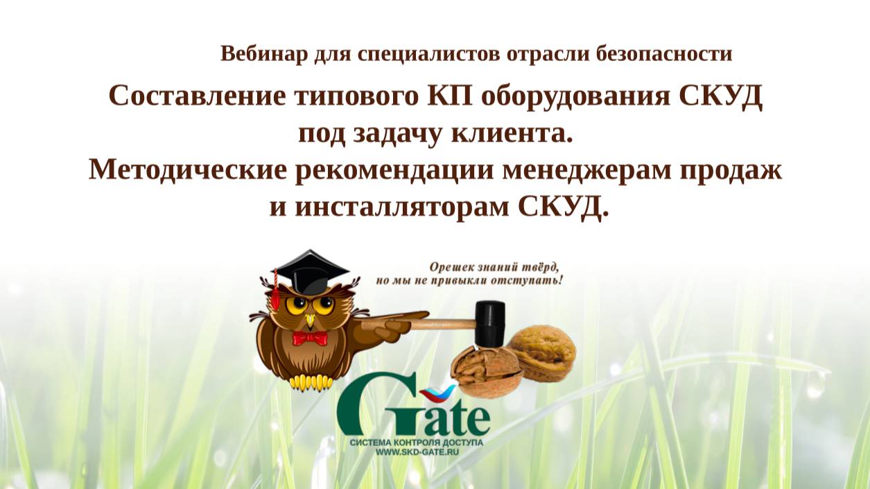 Тема вебинара: Составление типового КП оборудования СКУД под задачу клиента. Рекомендации менеджерам продаж и инсталляторам СКУД. Вопросы: - Общая типовая структура СКУД и основные принципы её построения. - Варианты решения задачи по составлению коммерческого предложения по комплекту оборудования для СКУД. - Основные исходные данные, необходимые для подбора оборудования для СКУД. - Пример простейшего варианта подбора оборудования под задачу клиента и алгоритм работы по составлению КП. - Рекомендации по сопутствующему оборудованию при составлении КП на СКУД. Вебинар предназначен для менеджеров продаж торговых домов сферы технических средств безопасности и начинающих специалистов отрасли СКУД и безопасности в целом. Докладчик: зам.ген.директора российского бренда СКУД Gate Кондратьев Евгений