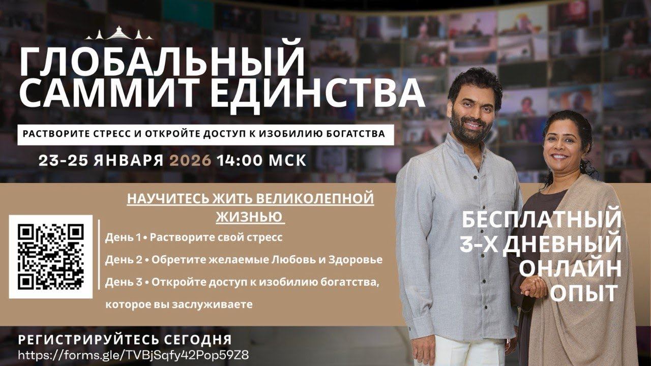 ONENESS GLOBAL SUMMIT 2026 Освободитесь от стресса и откройте изобилие с Просветлёнными Мастерами Шри Притаджи и Шри Кришнаджи Присоединяйтесь к БЕСПЛАТНОМУ 3-ДНЕВНОМУ ЖИВОМУ ОНЛАЙН-СОБЫТИЮ созданному, чтобы помочь вам избавиться от стресса, исцелить отношения и открыть жизнь в изобилии. Всего за три дня вы получите мощные инструменты, мистические технологии и освобождающие учения от Просветлённых Мастеров: *День 1:* Освобождение от стресса *День 2:* Обретение любви и здоровья, к которым вы стремитесь *День 3:* Открытие финансового благополучия и изобилия, которых вы заслуживаете Даты*: 23–25 января 2026 года (пятница–воскресенье) Время*: 14:0017:00 (МСК), ежедневно