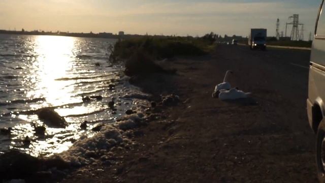 Песчаный пляж в Крыму. Лебеди нападают на людей в Евпатории