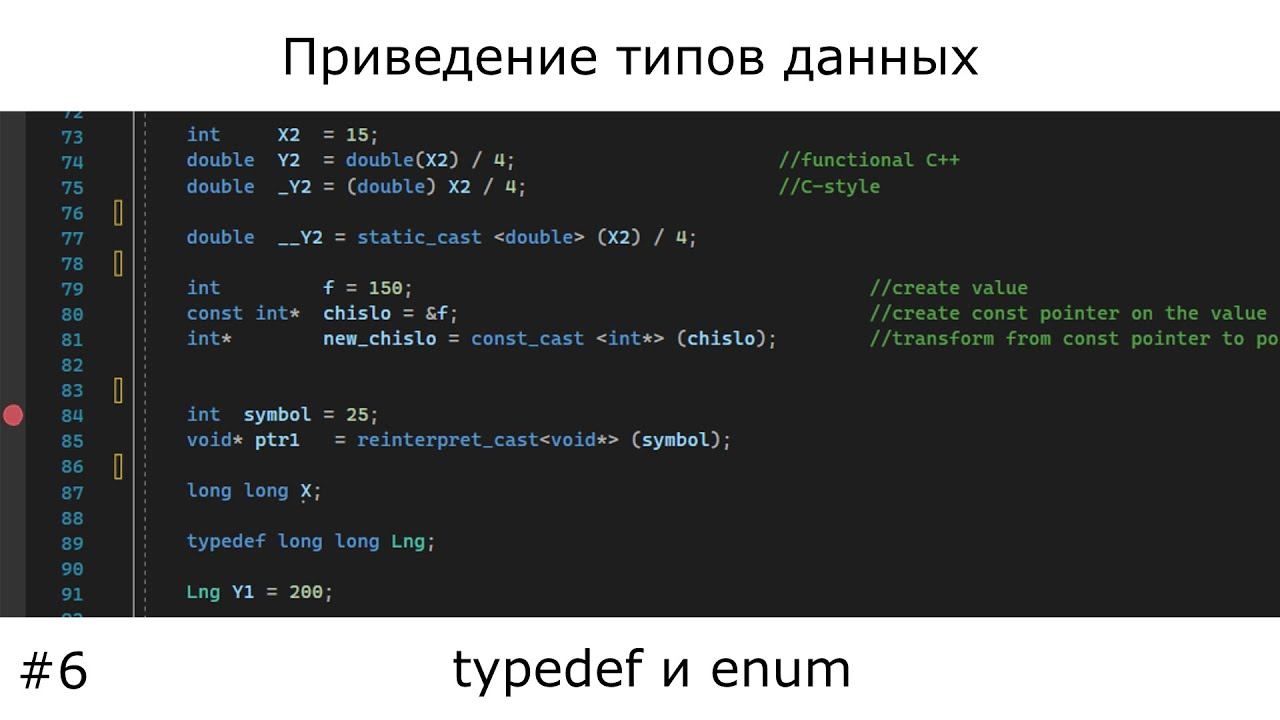 00:25 - зачем нужно и какие бывают приведения типов 02:47 - стиль C - style и функциональный способ 04:20 - static cast 06:20 - const cast 08:25 - dynamic cast ? 08:47 - reinterpret cast 09:45 - практические примеры 18:50 - typedef 20:30 - enum 22:52 - typedef + enum 24:50 - практический пример