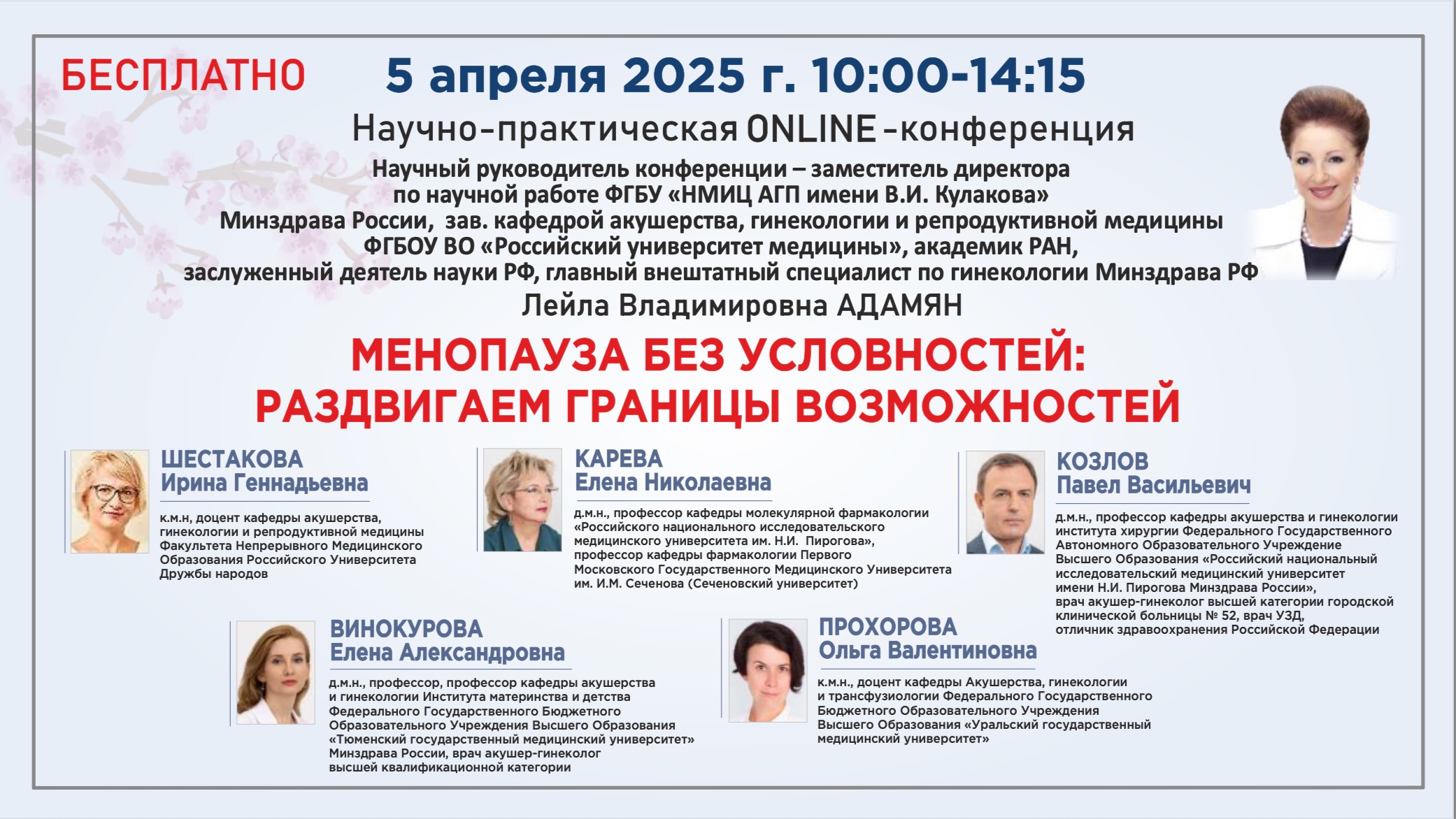 Научно-практическая конференция: Менопауза без условностей: раздвигаем границы возможностей Менопауза — довольно сложный период в жизни женщин, которые с ней сталкиваются. Наличие симптомов климакса снижает социальную адаптацию и работоспособность, поэтому при выборе тактики лечения климактерических расстройств индивидуальный подход к каждой пациентке является приоритетным. В рамках данной конференции ведущие спикеры представят свод критериев приемлемости назначения МГТ женщинам с сопутствующими сердечно-сосудистыми и метаболическими заболеваниями. Полученные знания станут настольным инструментом в ежедневной практике каждого врача, что в совокупности будет способствовать поддержанию активного, здорового долголетия женщин. Научный руководитель конференции: АДАМЯН Лейла Владимировна Заместитель директора ФГБУ «НМИЦ акушерства, гинекологии и перинатологии имени В.И. Кулакова» Минздрава России, зав. кафедрой репродуктивной медицины и хирургии ФГБОУ ВО «Российский университет медицины», академик РАН, заслуженный деятель науки РФ, главный внештатный специалист по гинекологии Минздрава РФ Спикеры: ШЕСТАКОВА Ирина Геннадьевна - к.м.н, доцент кафедры акушерства, гинекологии и репродуктивной медицины Факультета Непрерывного Медицинского Образования Российского Университета Дружбы народов ВИНОКУРОВА Елена Александровна — д.м.н., профессор, профессор кафедры акушерства и гинекологии Института материнства и детства ФГБОУ ВО «Тюменский государственный медицинский университет» Минздрава России, врач акушер-гинеколог высшей квалификационной категории КАРЕВА Елена Николаевна — д.м.н., профессор кафедры молекулярной фармакологии «Российского национального исследовательского медицинского университета им. Н.И. Пирогова», профессор кафедры фармакологии Первого Московского Государственного Медицинского Университета им. И. М. Сеченова (Сеченовский университет) ПРОХОРОВА Ольга Валентиновна— к.м.н., доцент кафедры Акушерства, гинекологии и трансфузиологии Федерального Государственного Бюджетного Образовательного Учреждения Высшего Образования «Уральский государственный медицинский университет» КОЗЛОВ Павел Васильевич — д.м.н., профессор кафедры акушерства и гинекологии института хирургии Федерального Государственного Автономного Образовательного Учреждение Высшего Образования «Российский национальный исследовательский медицинский университет имени Н. И. Пирогова Минздрава России», врач акушер-гинеколог высшей категории городской клинической больницы № 52, врач УЗД, отличник здравоохранения Российской Федерации 1) "КЛИМАКТЕРИЙ: ПЕРВЫЕ ШАГИ ДИАГНОСТИКИ И ТЕРАПИИ" ( Шестакова Ирина Геннадьевна ) 2) "МЕНОПАУЗАЛЬНАЯ ГОРМОНОТЕРАПИЯ ПО ПРИНЦИПАМ 5 П" ( Винокурова Елена Александровна ) 3) "ВЫБОР МГТ У ПАЦИЕНТОК С ПОВЫШЕННОЙ МАССОЙ ТЕЛА" ( КАРЕВА Елена Николаевна ) 4) "СКЕЛЕТНО-МЫШЕЧНЫЙ СИНДРОМ МЕНОПАУЗЫ: КЛИНИКО-ТЕРАПЕВТИЧЕСКИЕ ПАРАЛЛЕЛИ" ( Прохорова Ольга Валентиновна ) 5) "НФИТОЭСТРОГЕНЫ НОВОГО ПОКОЛЕНИЯ ДЛЯ ПОДДЕРЖАНИЯ ЗДОРОВЬЯ ЖЕНЩИНЫ И ПРОФИЛАКТИКИ ВОЗРАСТНЫХ ИЗМЕНЕНИЙ" ( Козлов Павел Васильевич ) «Дискуссия. Ответы на вопросы» Адамян Л.В., Шестакова И.Г., Винокурова Е.А., Карева Е.Н., Прохорова О.В., Козлов П.В.