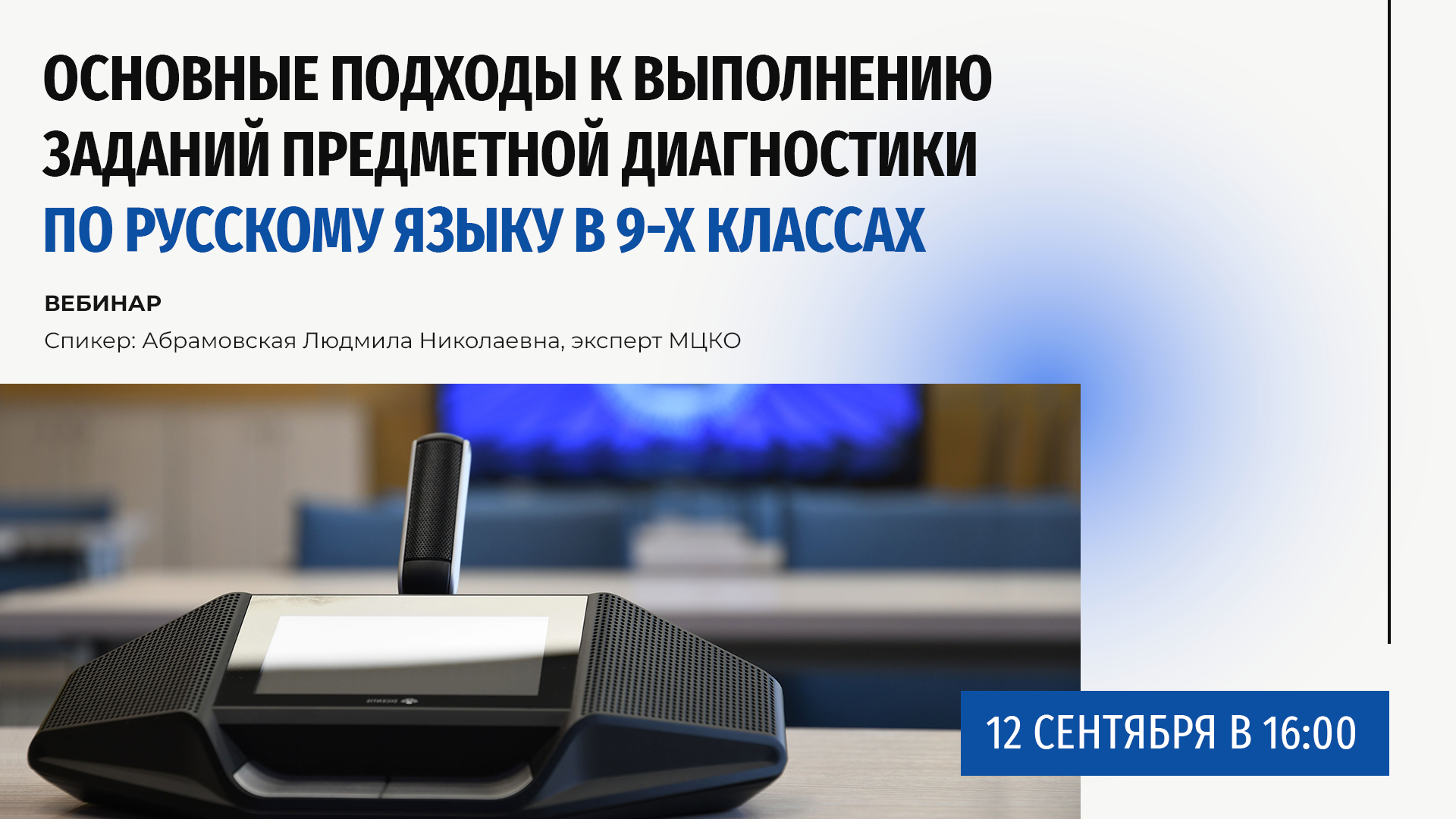 Вебинар по основным подходам к выполнению заданий предметной диагностики по русскому языку в 9-х классах. Спикер: Людмила Николаевна Абрамовская, эксперт отдела методического обеспечения процедур оценки качества общего образования Московского центра качества образования