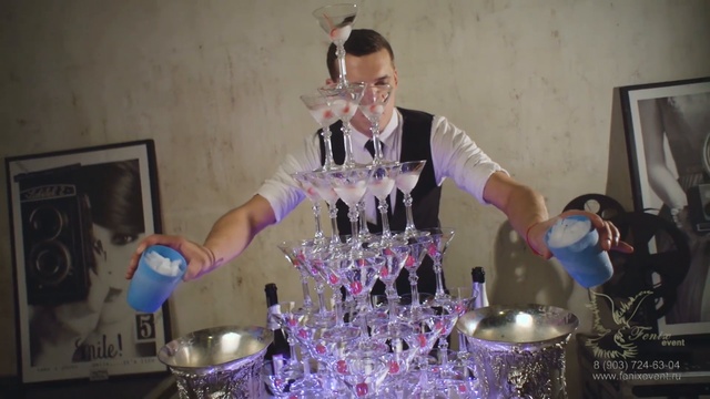 Заказать бармен шоу на корпоратив, праздник, свадьбу и новый год Москва - пирамида шампанского
