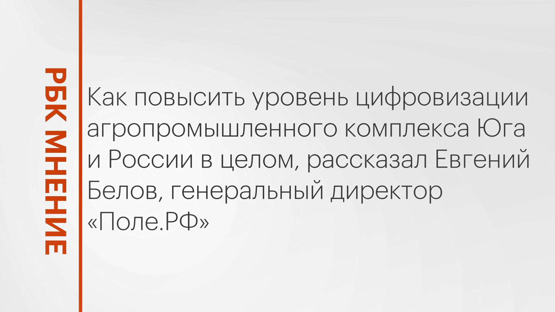 Как повысить уровень цифровизации агропромышленного комплекса Юга и России в целом, рассказал Евгений Белов, генеральный директор «Поле.РФ». Подписывайтесь на нас в социальных сетях: ВКонтакте: https://vk.com/rbcyug Telegram: https://t.me/rbc_krasnodar, https://t.me/rbcrostov, https://t.me/rbc_kavkaz Подпишитесь на канал РБК Юг, чтобы смотреть новые выпуски первыми!