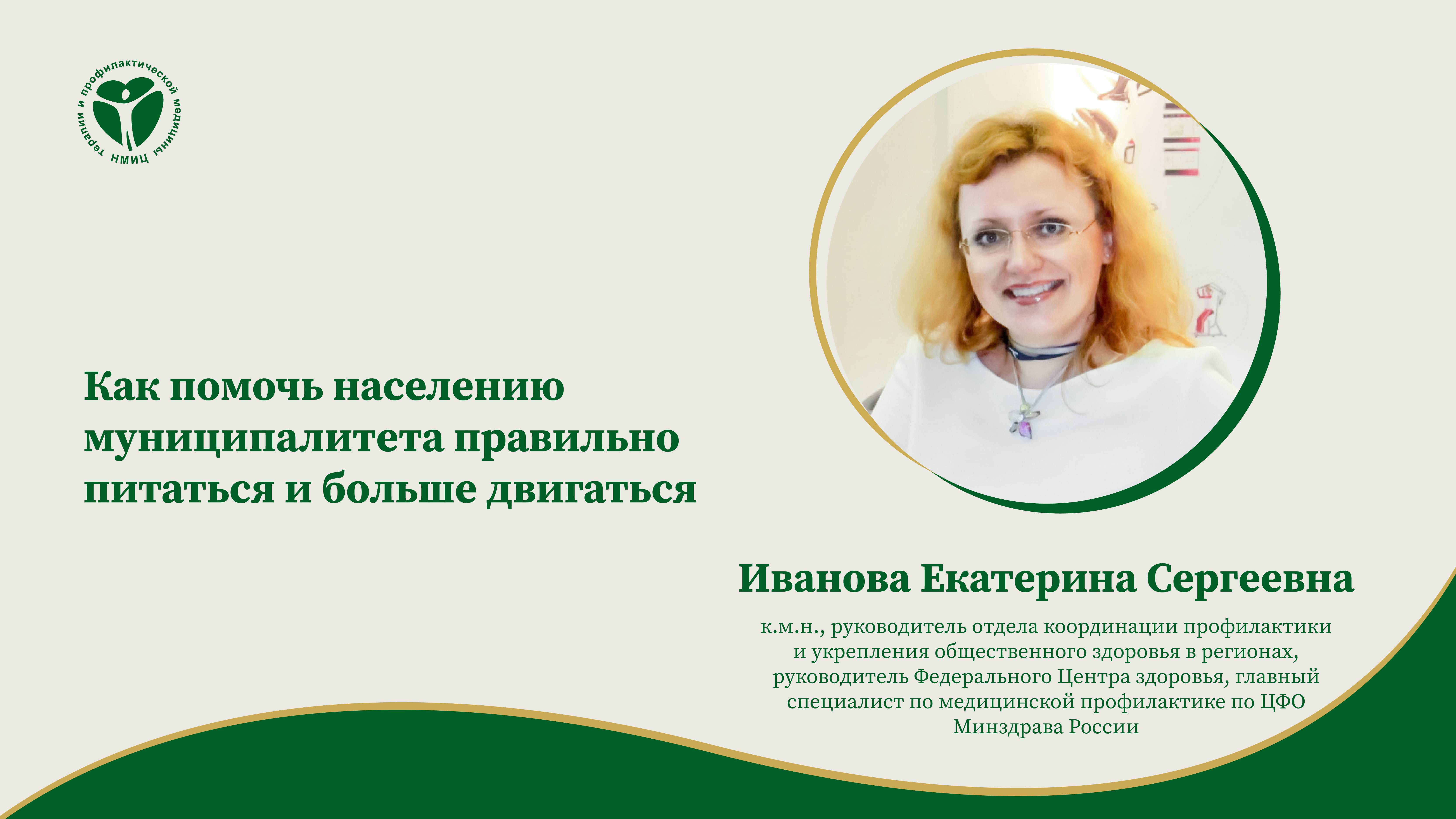 «Как помочь населению муниципалитета правильно питаться и больше двигаться», лекция от 31.07.2024. Лектор: Иванова Екатерина Сергеевна, к.м.н., руководитель отдела координации профилактики и укрепления общественного здоровья в регионах, руководитель Федерального Центра здоровья, главный специалист по медицинской профилактике по ЦФО Минздрава России.