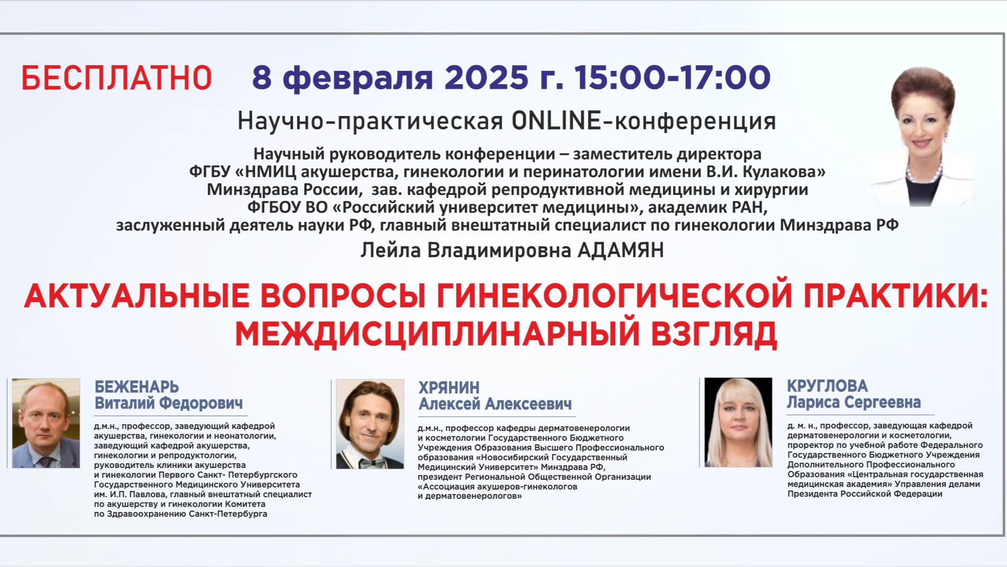 Научно-практическая онлайн конференция: Актуальные вопросы гинекологической практики: междисциплинарный взгляд Эндометриоз диагностируется у каждой десятой пациентки репродуктивного возраста. Известно, что в 60% случаев наружный генитальный эндометриоз вызывает развитие спаечного процесса в малом тазу, который может происходить de novo в результате местной воспалительной реакции, а также после хирургического лечения. Поэтому патогенетически обосновано применение противофиброзных ферментов, препятствующих развитию воспалительного и спаечного процесса. Среди разнообразных вариантов вагинальной инфекции бесспорными лидерами считаются вульвовагинальный кандидоз и бактериальный вагиноз, выявляемые соответственно у 17-39% и 22-50% женщин с патологическими выделениями из влагалища. Смешанные инфекции, развивающиеся при выраженном дисбалансе влагалищной микрофлоры, составляют 25–30% в структуре инфекционных заболеваний нижних отделов полового тракта. Важным патогенетическим механизмом возникновения сочетанной инфекции является формирование бактериально-грибковых биопленок. Поэтому ферментативное разрушение биопленок может стать ключевой стратегией ведения таких пациенток. Исследования показывают, что каждый год у 100 миллионов человек по всему миру появляются шрамы после травм и хирургических вмешательств, и 15 миллионов из них имеют неэстетические или гипертрофические и келоидные рубцы. Актуальность вопросов терапии рубцовых деформаций подчеркивает то обстоятельство, что среди лиц, обращающихся в косметологическое учреждение для коррекции рубцовых деформаций около 40-50%, при этом большинство из них - это молодые люди в возрасте наибольшей социальной активности – до 40 лет. В этой связи идет поиск новых эффективных методов коррекции рубцовых изменений, к которым относится ферментная противофиброзная терапия. Научный руководитель конференции: АДАМЯН Лейла Владимировна Заместитель директора ФГБУ «НМИЦ акушерства, гинекологии и перинатологии имени В.И. Кулакова» Минздрава России, зав. кафедрой репродуктивной медицины и хирургии ФГБОУ ВО «Российский университет медицины», академик РАН, заслуженный деятель науки РФ, главный внештатный специалист по гинекологии Минздрава РФ Спикеры: БЕЖЕНАРЬ Виталий Федорович - д.м.н., профессор, заведующий кафедрой акушерства, гинекологии и неонатологии, заведующий кафедрой акушерства, гинекологии и репродуктологии, руководитель клиники акушерства и гинекологии Первого Санкт- Петербургского Государственного Медицинского Университета им. И.П. Павлова, главный внештатный специалист по акушерству и гинекологии Комитета по Здравоохранению Санкт-Петербурга ХРЯНИН Алексей Алексеевич – д.м.н, профессор кафедры дерматовенерологии и косметологии Государственного Бюджетного Учреждения Образования Высшего Профессионального Образования «Новосибирский Государственный Медицинский Университет» Минздрава России; президент Региональной Общественной Организации «Ассоциация акушеров-гинекологов и дерматовенерологов КРУГЛОВА Лариса Сергеевна - д. м. н., профессор, заведующая кафедрой дерматовенерологии и косметологии, и.о. ректора, проректор по учебной работе Федерального Государственного Бюджетного Учреждения Дополнительного Профессионального Образования «Центральная г