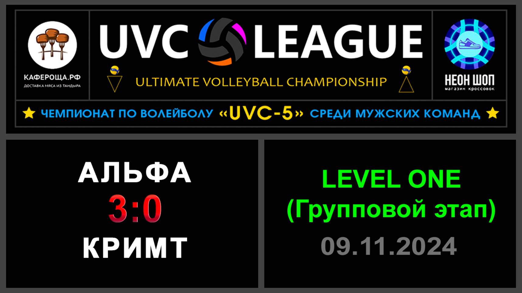 UVC-4 (Мужчины): Чемпионат UVC Лиги по волейболу среди мужских команд, 2024-2025 гг. Результаты игры: LEVEL ONE (Групповой этап) 09.11.2024 Альфа - КрИМТ 3:0 (25:20, 25:18, 25:19) Конкурс «РЕШАЛА»: ✅КрИМТ прошел в следующий этап! ⛔Альфа завершили своё участие на третьем этапе! Конкурс «Робин Гуд»: ⛔Точных попаданий не было! #UVC_ЛИГА_ЧЕМПИОНАТ_UVC_5_Мужчины