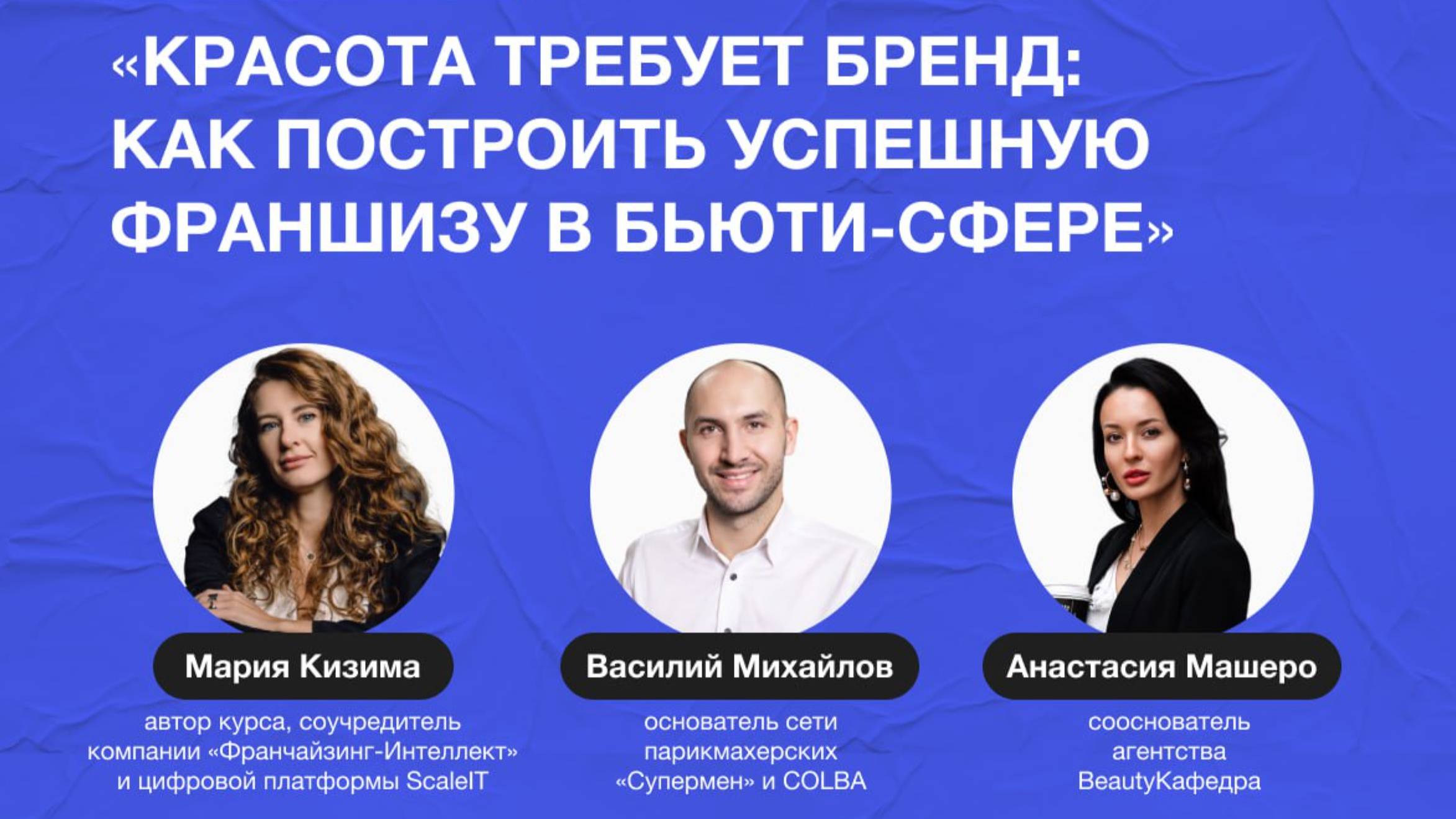 Спикеры: - Мария Кизима (https://t.me/kizima_highlights), автор курса, соучредитель компании «Франчайзинг-Интеллект» и цифровой платформы ScaleIT; - Василий Михайлов, основатель сети парикмахерских «Супермен» и COLBA; - Анастасия Машеро, сооснователь агентства BeautyКафедра. Что обсудим: - франчайзинговые тренды в бьюти-сфере, или как усилить концепт франшизы; - масштабирование через систематизацию: как организовать «внутреннюю кухню» бренда и работу филиалов; - решение проблемы кадрового голода в индустрии красоты и другие актуальные задачи, которые должна брать на себя эффективная управляющая компания; - правовые основы франчайзинга: существенные условия договора коммерческой концессии и способы защиты интеллектуальной собственности компании.