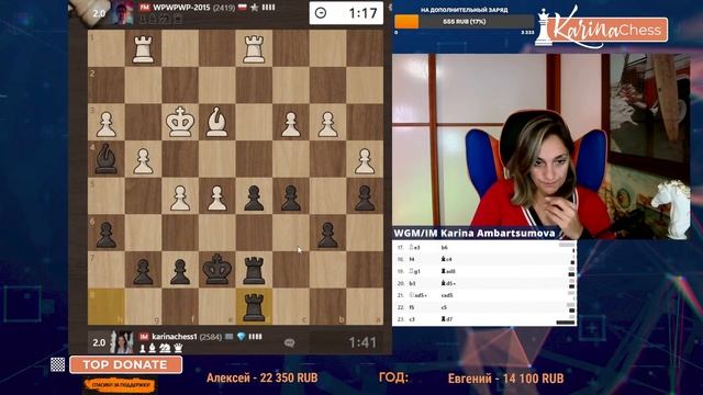 Титульный вторник на chess.com 11 туров 3+1 Поддержать канал: https://www.donationalerts.com/r/karinachess1 Обучающее сообщество: https://boosty.to/karinachess Подписаться на мой канал: https://www.youtube.com/channel/UChor8u_hhgrjX2lt0QLzZHA?sub_confirmation=1 Обучающий курс "Пешечные структуры" http://bit.do/pawns-structures Рестрим: https://www.twitch.tv/karinachess1 Рада приветствовать Вас на канале женского международного гроссмейстера, международного мастера Карины Амбарцумовой! Я - профессиональная шахматистка и тренер. Здесь вы сможете найти обучающие видеоуроки по шахматам, комментарии турниров, стримы моей игры в блиц шахматы. Подписывайтесь на мои странички в соц.сетях: ВКонтакте: https://vk.com/karinachessclub Telegram: https://t.me/karinachess Twitch: https://www.twitch.tv/karinachess1 Почта для связи: karinachess@mail.ru Мой сайт: http://chesscoach.ru/