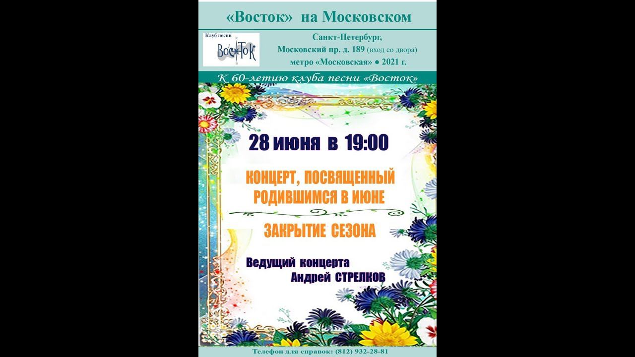 Концерт, посвящённый родившимся в июне. Закрытие сезона клуба песни «Восток». Ведущий - Андрей Стрелков. 28 июня 2021 г. Клуб песни «Восток». Санкт-Петербург, Московский пр., 189. Видеозапись и монтаж - Алла Левитан. Запись звука - Геннадий Демин.