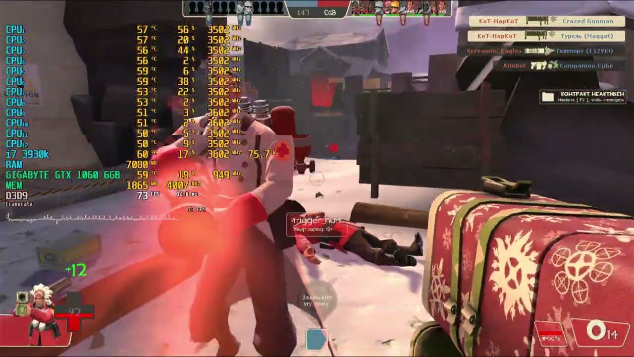 Game: Team Fortress 2 Сomputer characteristics: Socket: LGA 2011 Motherboard: Asus Sabertooth X79 Processor: i7 3930K 3.20GHZ RAM: HYPER X 16GB DDR3-DIMM 1600 GPU: Gigabyte GTX 1060 OC 6GB ROM: HDD 500GB OS+HDD 2TB+ HDD 1TB Video in 1920x1080 resolution. Operating system: Windows 10 Pro