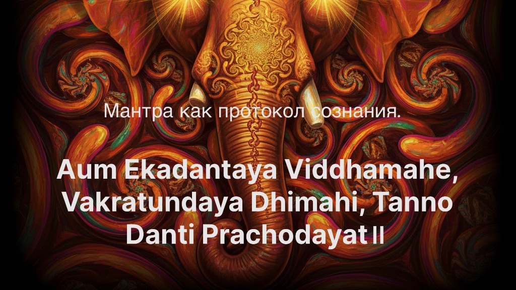 В системе Трика мантра - это не «молитва» в бытовом смысле. Это интерфейс, протокол связи между индивидуальным сознанием (ану) и универсальным Сознанием (Шивой). Это код, который перезагружает наше восприятие, переводя его из режима двойственности (двайта) в режим распознавания единой Сущности (адвайта). Мантра - это живая схема Шакти, звуковая янтра, которая при правильном «запуске» производит конкретные изменения в структуре осознавания. Рассмотрим знаменитую мантру Ганеши, Вакратунды, через эту призму. Текст мантры: ॐ एकदन्ताय विद्धमहे, वक्रतुण्डाय धीमहि, तन्नो दन्ति प्रचोदयात्॥ Aum Ekadantaya Viddhamahe, Vakratundaya Dhimahi, Tanno Danti Prachodayat॥ Деконструкция протокола: семантика и со-знание Традиционный перевод дает нам поверхностный, образный слой. Но в Трике мы идем глубже, к сватантрии (самосущности) звука. · ॐ (Аум) – Инициализация системы. Не просто «священный слог», а полная развертка реальности: А (созидание, бодрствование), У (сохранение, сон), М (разрушение, глубокий сон) и четвертый, невыразимый аспект - тишина за слогом (Турья, единство). Произнося «Аум», мы не «начинаем молиться», а запускаем процесс синхронизации нашего индивидуального «я» с изначальной вибрацией вселенной. Это команда CONNECT. · एकदन्ताय विद्धमहे (Экадантая виддхамахе) – Прошивка для преодоления дуальности. · एकदन्ताय (Экадантая) - «Тому, у кого один бивень». Это ключевая метапрограмма. Слоновий бивень - символ мощи, инструмент. Два бивня - это дуальность: добро/зло, я/другой, субъект/объект. Один бивень - это свидетельство трансцендирования всех пар противоположностей. Это не «поломка», а знак высшей целостности. Бог-Слоноликий (Ганеша) здесь - не отдельное божество, а сама Шакти распознавания (вимарша-шакти), способность Сознания знать само себя, не дробиясь на знающего и знаемое. · विद्धमहे (Виддхамахе) - от корня «видх» — пронизывать, достигать, познавать. Это не просто «мы поклоняемся». Это акт тотального проникновения и отождествления. «Мы прошиваем свое существо этим знанием о недвойственности». Мы не просим у внешней сущности - мы активируем в себе этот принцип Экаданты. · वक्रतुण्डाय धीमहि (Вакратундая дхимахи) – Активация энергии трансформации препятствий. · वक्रतुण्डाय (Вакратундая) - «Тому, у кого изогнутый хобот». Хобот — символ невероятной силы (может вырвать дерево) и нежной точности (может поднять травинку). Его изогнутость - это не случайность, а алгоритм. Он обходит преграды, огибает сопротивление, не ломая его, а интегрируя в путь. В контексте сознания - это сила иччха-шакти (сила воли/желания), которая не движется грубо по прямой, а мудро и изящно преобразует любое препятствие (вигхна) в ступень для роста. · धीमहि (Дхимахи) - «Мы медитируем, удерживаем в осознавании». Это команда FOCUS. Мы не просто констатируем факт изогнутого хобота, мы направляем и удерживаем луч своего внимания на этом принципе, делая его рабочей схемой нашего ума. · तन्नो दन्ति प्रचोदयात् (Танно данти прачодаят) – Запрос на компиляцию и выполнение. · तन्नो (Танно) — «Нам того». · दन्ति (Данти) — «Имеющего бивень». Повторный вызов принципа Экаданты. · प्रचोदयात् (Прачодаят) — «Пусть вдохновит, побудит, приведет в движение». Это финальная команда EXECUTE. «Пусть тот принцип недвойственности (единый бивень) приведет в движе