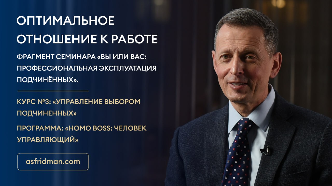 Оптимальное отношение к работе Фрагмент семинара «Вы или Вас: профессиональная эксплуатация подчинённых». Курс №3: «Управление выбором подчиненных» Программа: «Homo Boss: Человек Управляющий» Расписание открытых семинаров Александра Фридмана: https://www.asfridman.com/raspisanie/