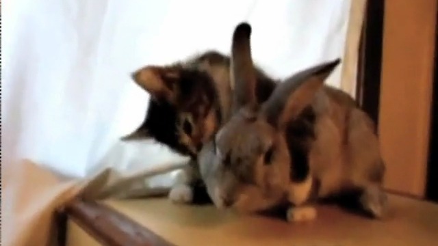 Котенок облизывает кролика