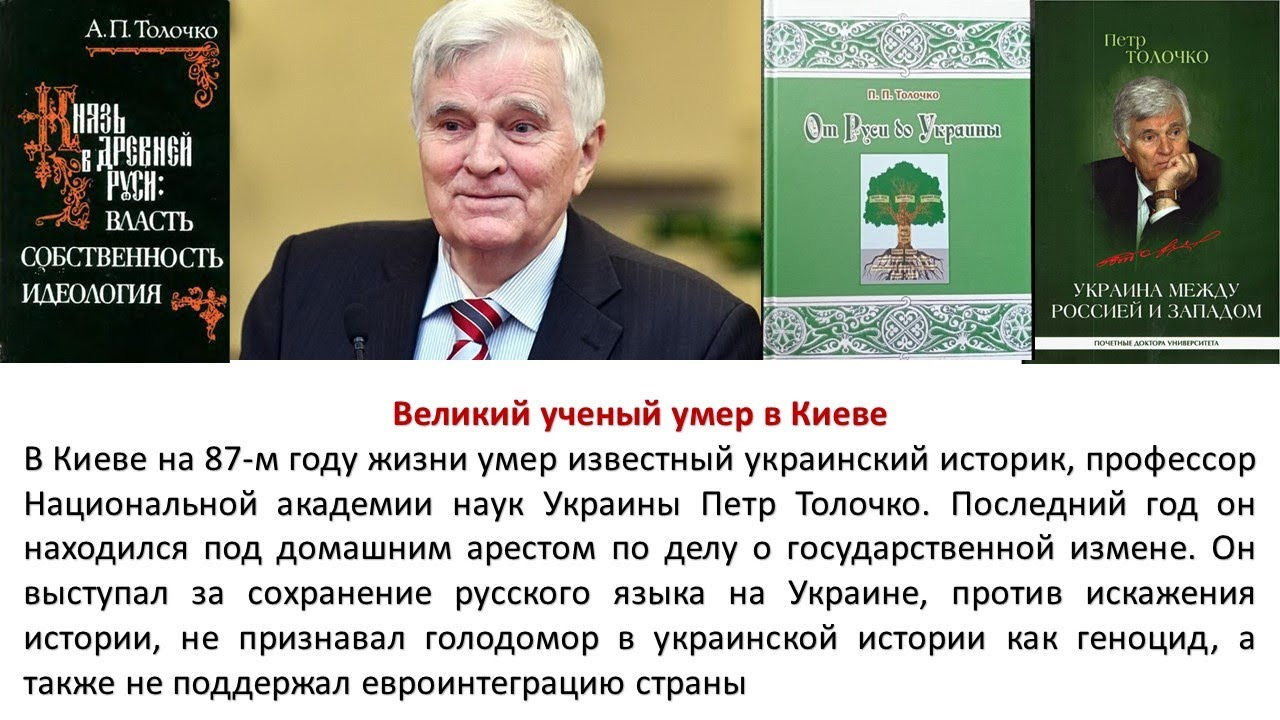 Пётр Петро́вич Толо́чко (укр. Петро Петрович Толочко; 21 февраля 1938, Пристромы, Киевская область — 28 апреля 2024) — советский и украинский историк-медиевист, археолог, профессор (1988), академик НАН Украины (18.05.1990), иностранный член Российской академии наук (22.12.2011, 8 марта 2022 года подал заявление о выходе из состава иностранных членов РАН, в 1987—2017 директор Института археологии НАН Украины (c 2017 почётный директор), народный депутат Украины III—IV созывов (1998—2006), член Академии Европы и Международного союза славянской археологии. Лауреат Государственной премии УССР и Украины в области науки и техники (1983, 2002). Известнейший украинский ученый, историк, академик Петр Петрович Толочко скончался на 87 году жизни под домашним арестом в городе Киеве 29 апреля 2024 года. Автор этих записок когда-то была знакома с ним лично и вспоминает о встречах с талантливейшим ученым и мужественным человеком. Который, несмотря на всю травлю и беды, остался верен себе и своим убеждениям. После Майдана 2014 года Петр Петрович Толочко не поменял своих взглядов в угоду майданной конъюнктуре, смело выражал свое мнение. Он считал Россию, Украину и Белоруссию едиными историческими землями, а русских, украинцев и белорусов искусственно и трагически разделенным единым народом. Высокий, статный, с гордой осанкой он сам словно походил на древнерусских, славянских князей, о которых писал книги и знал так много, что равных ему не было. Он был директором института археологии в Киеве, но после Майдана 2014 года его подвергли обструкции, начав настоящую травлю, вынудив написать заявление об уходе с должности. На заседания ученого совета и в его кабинет врывались «правосеки» (организация «Правый сектор» признана экстремисткой и запрещена в РФ), грозили убийством, пытались физически и морально сломить ученого. Но он не боялся своих ничтожных «оппонентов». Самому Толочко после увольнения с поста директора института археологии практически перекрыли «кислород», лишили возможностей преподавательской деятельности, общения с молодежью, сотрудниками института, студентами и его аспирантами. Переживал изоляцию Петр Петрович тяжело. Петр Толочко часто напоминал, что Киевская Русь - это не только украинская Русь, как «присвоили» себе этот статус в незалежной, а еще и огромные славянские земли, которые в свое время объединял князь Олег, пришедший из Новгорода. Исторические изыскания Петра Толочко раздражали киевские власти и ученого стали открыто обвинять в пророссийских взглядах. И тут Толочко каждый раз вспоминал Богдана Хмельницкого, который буквально спас украинцев от польского гнета, от издевательств польских панов. Благодаря Хмельницкому договор Переясловской Рады, который Украина отменила в 21 веке, спас тогда по сути украинцев от гибели. Ученый называл прошение Богдана Хмельницкого русскому царю актом клятвенным и спасительным для Украины.