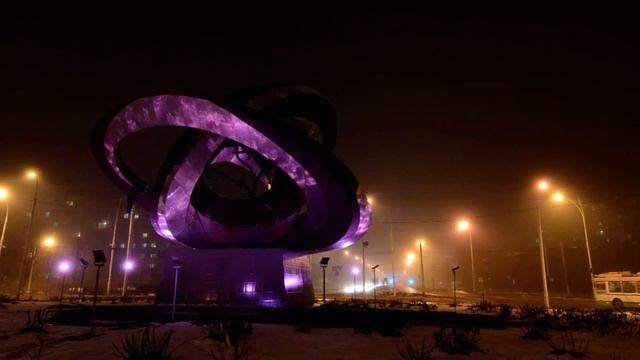 Под Новый 2016 год, скульптурная композиция "Мирный атом" засияла разноцветным светом.