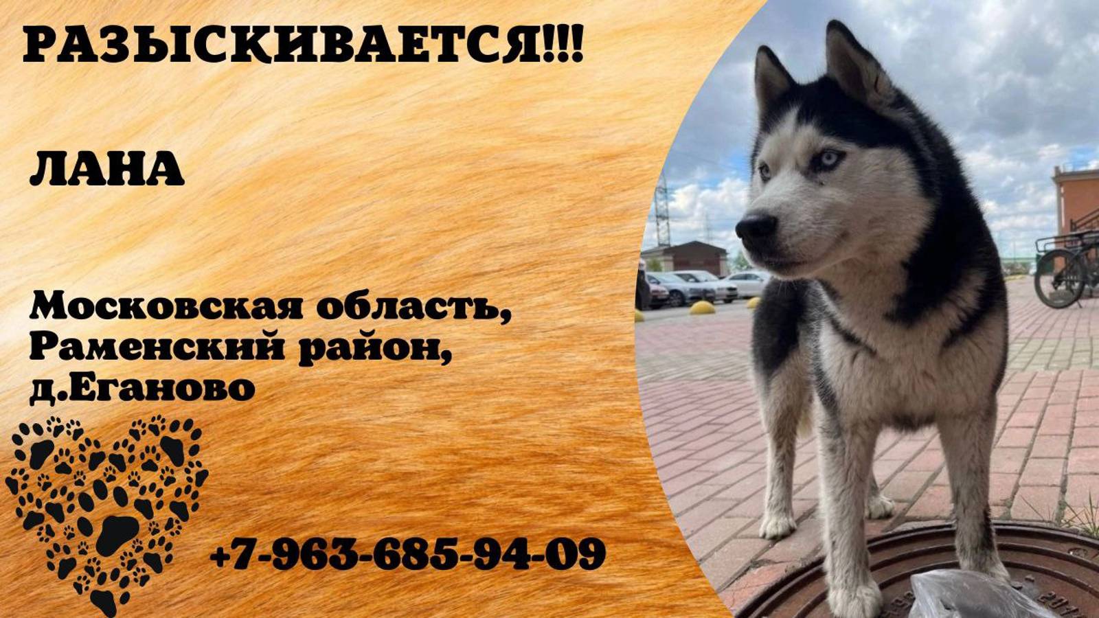 Московская Раменский Пропала собака Пропала хаски. Лана. Собака со сложной судьбой. Дошла с Домодедово до Химок за три месяца в 2022 году. Хозяин от неё отказался и мы нашли ей ручки. Но вот в конце июня 2024г она сбежала. Раменский район, деревня Еганово. У неё есть чип, чип с данными старых хозяев. Пожалуйста, помогите найти Лану. 89636859409. Инфо https://vk.com/wall-198815410_152454 Автор https://vk.com/polina_skl