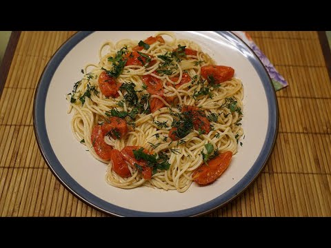 Спагетти с помидорами черри и ароматным маслом.
