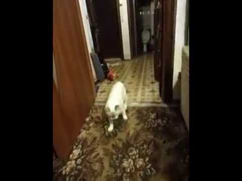 Кошка Флэшка играючи выполняет команду апорт.