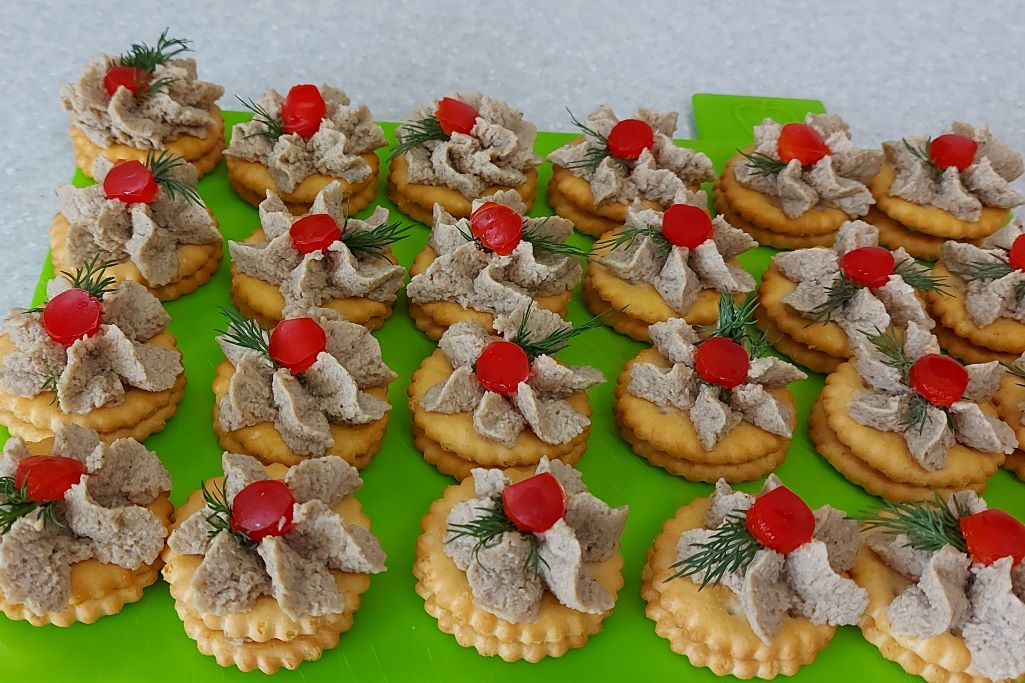 Закуска из курицы и грибов. Рецепт: Печенье крекер соленый 200 гр. филе куриное 270 гр. лук репчатый 70 гр. грибы 180 гр. чеснок 1 зуб. масло слив. 15 гр. + 50 гр. соль, перец.